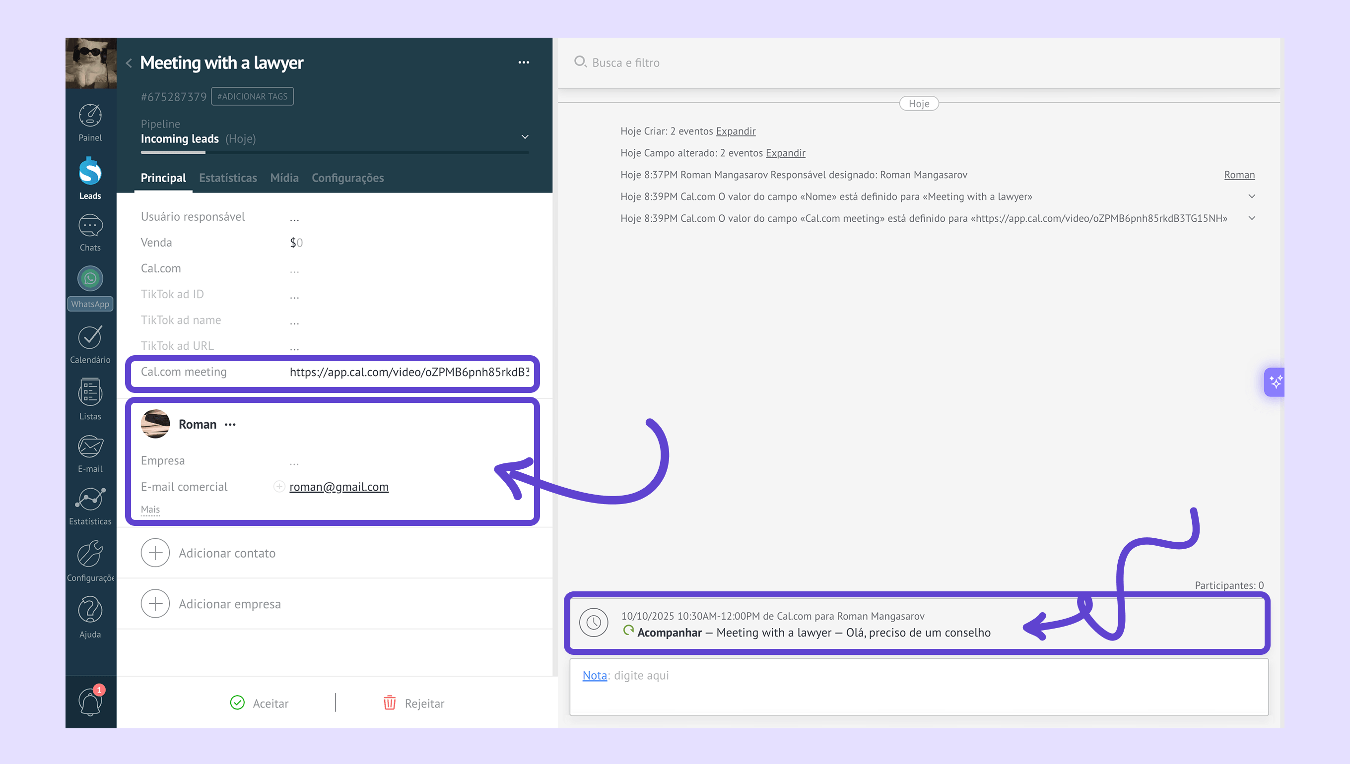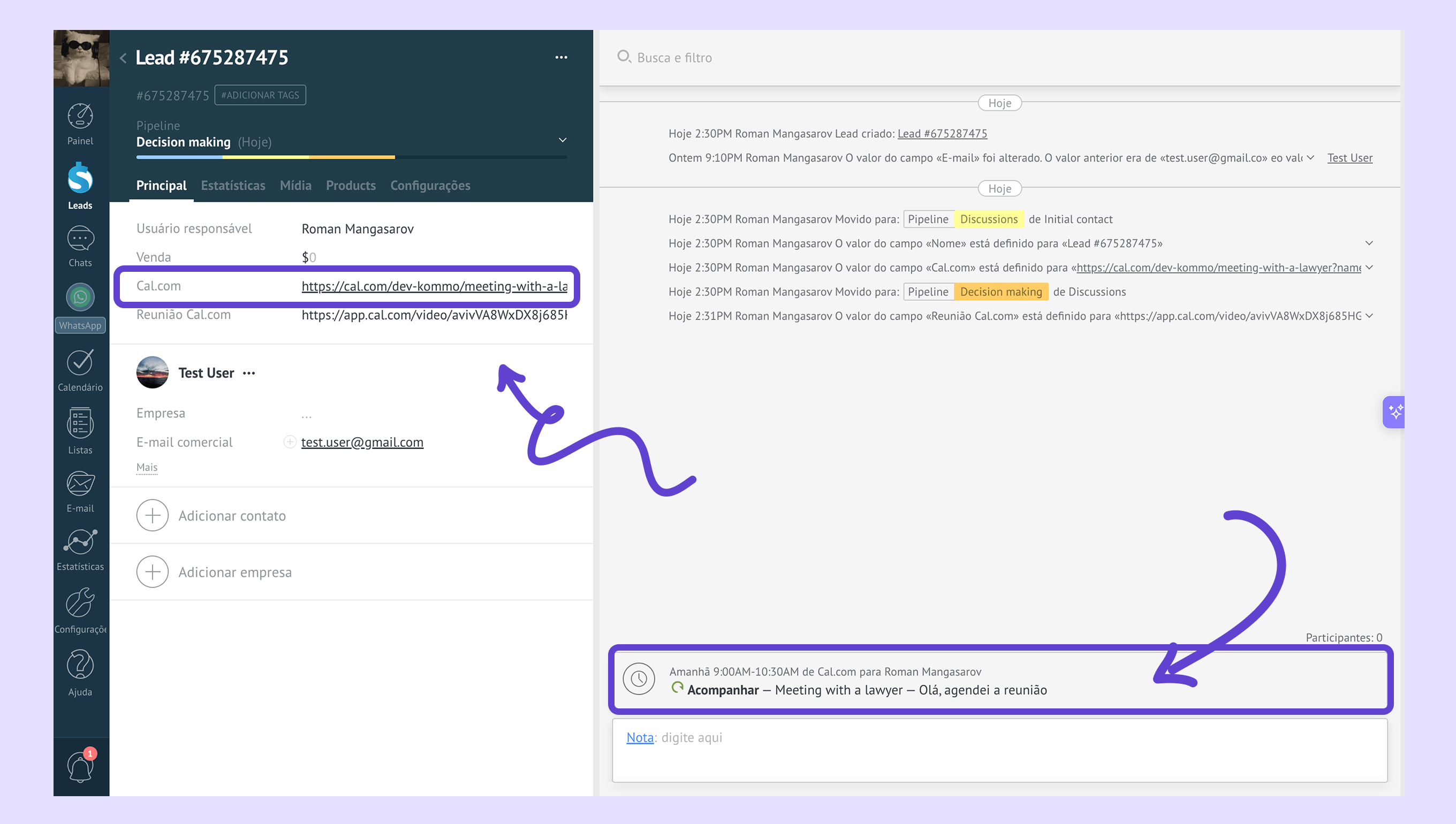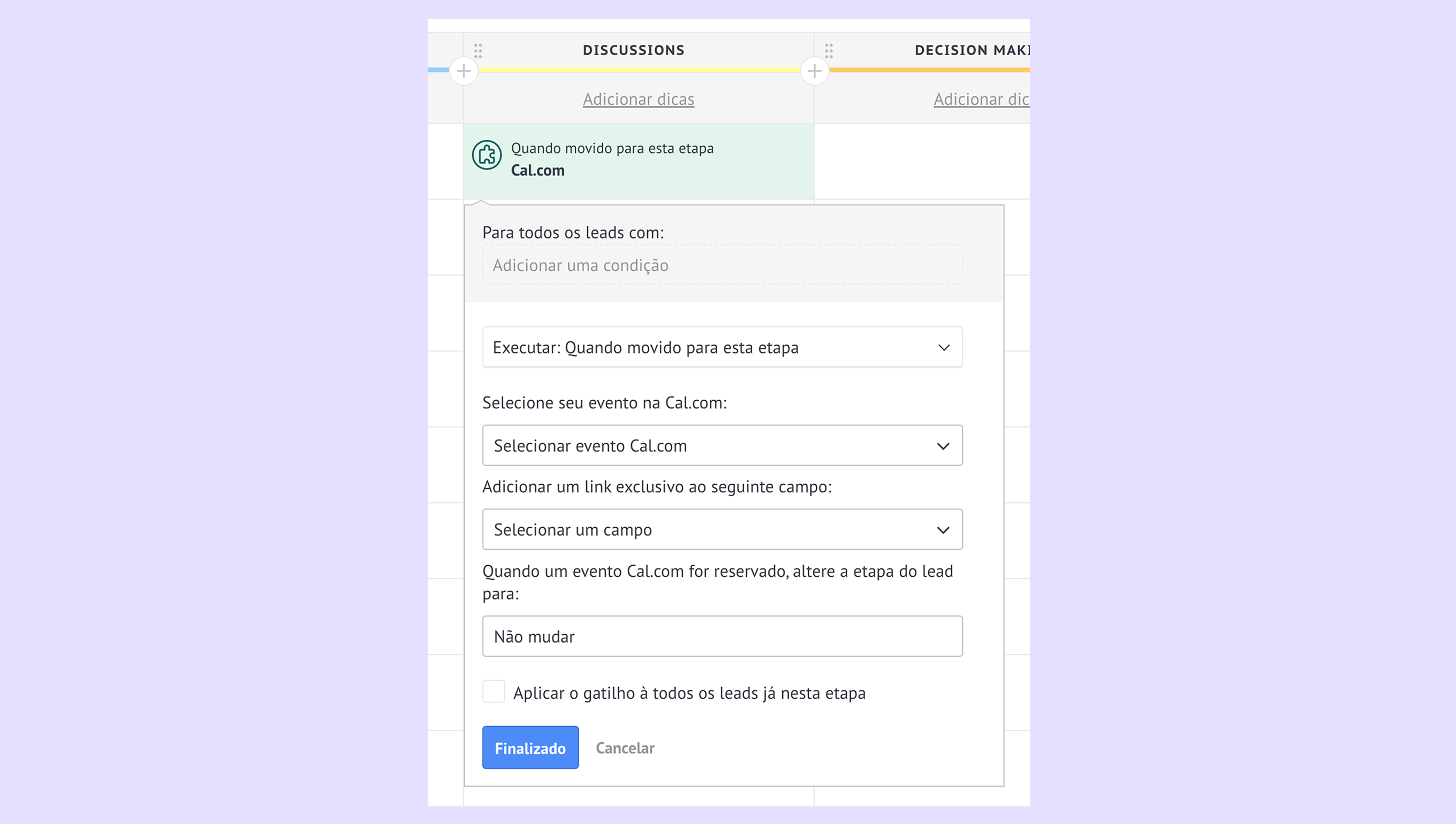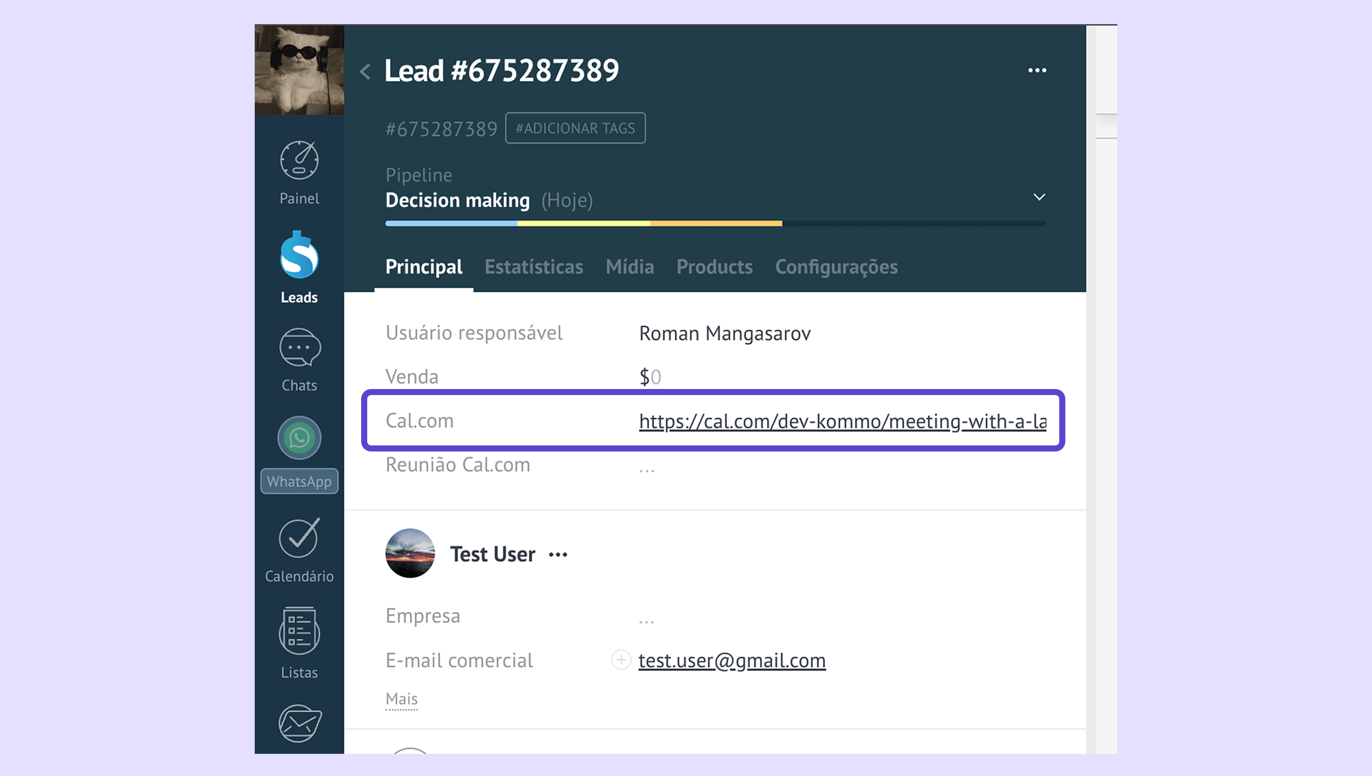 Observação: O campo personalizado da Cal.com é criado automaticamente no perfil do lead quando a integração é instalada.