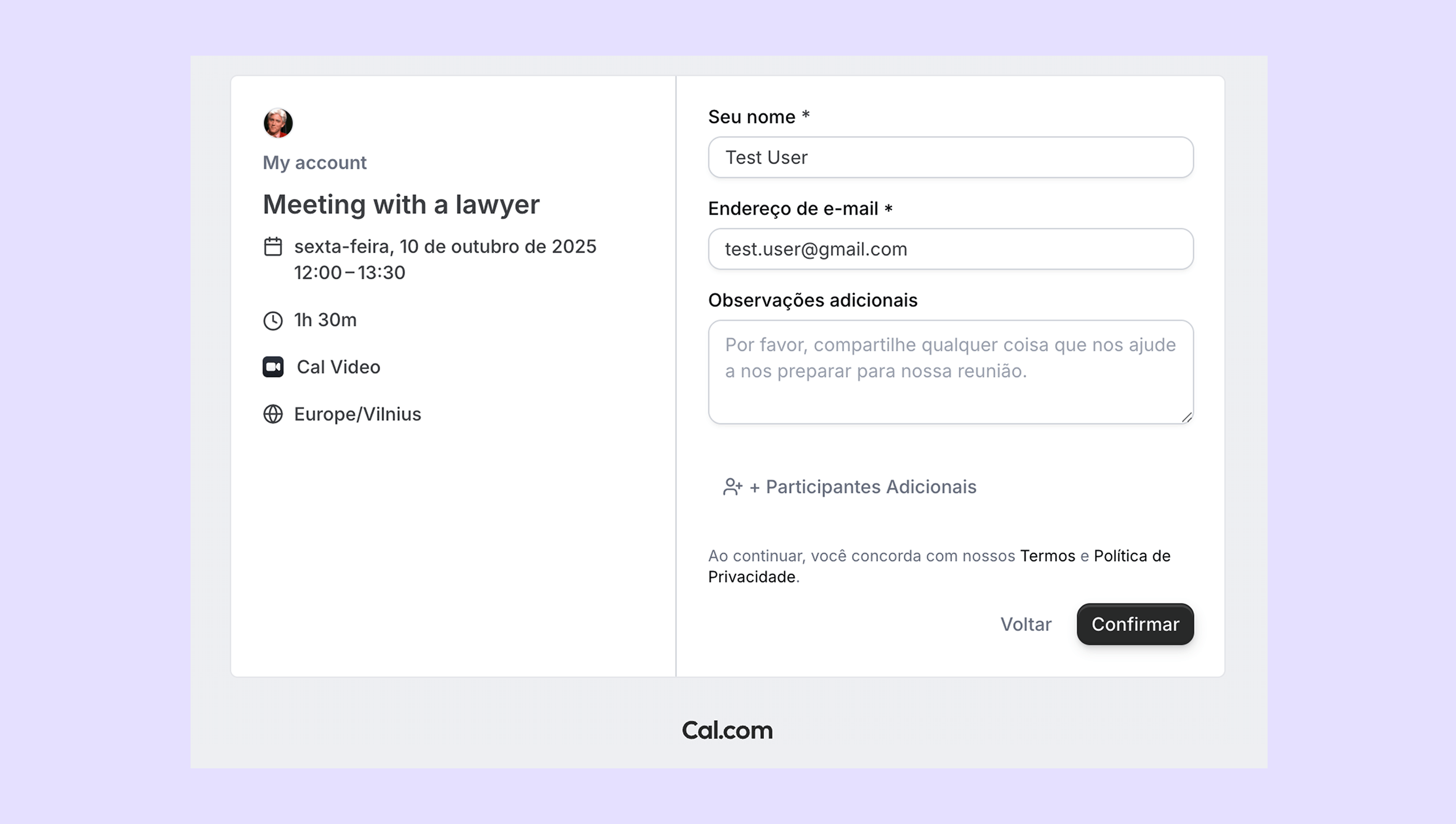 Se um cliente reservar por meio de um link externo da Cal.com (como um link no seu site ou um anúncio), ele preencherá seu nome, email e uma mensagem opcional antes de reservar.
