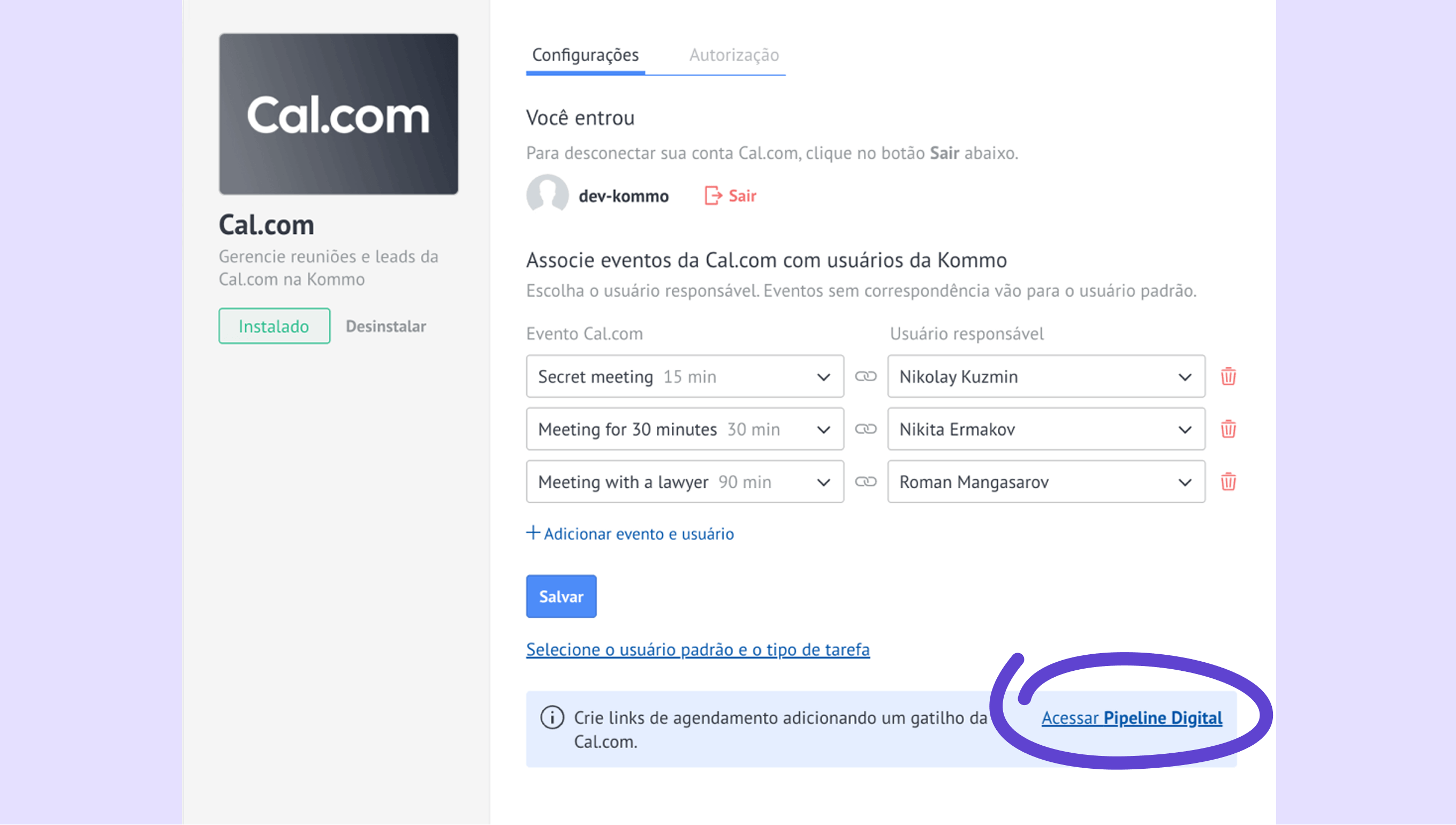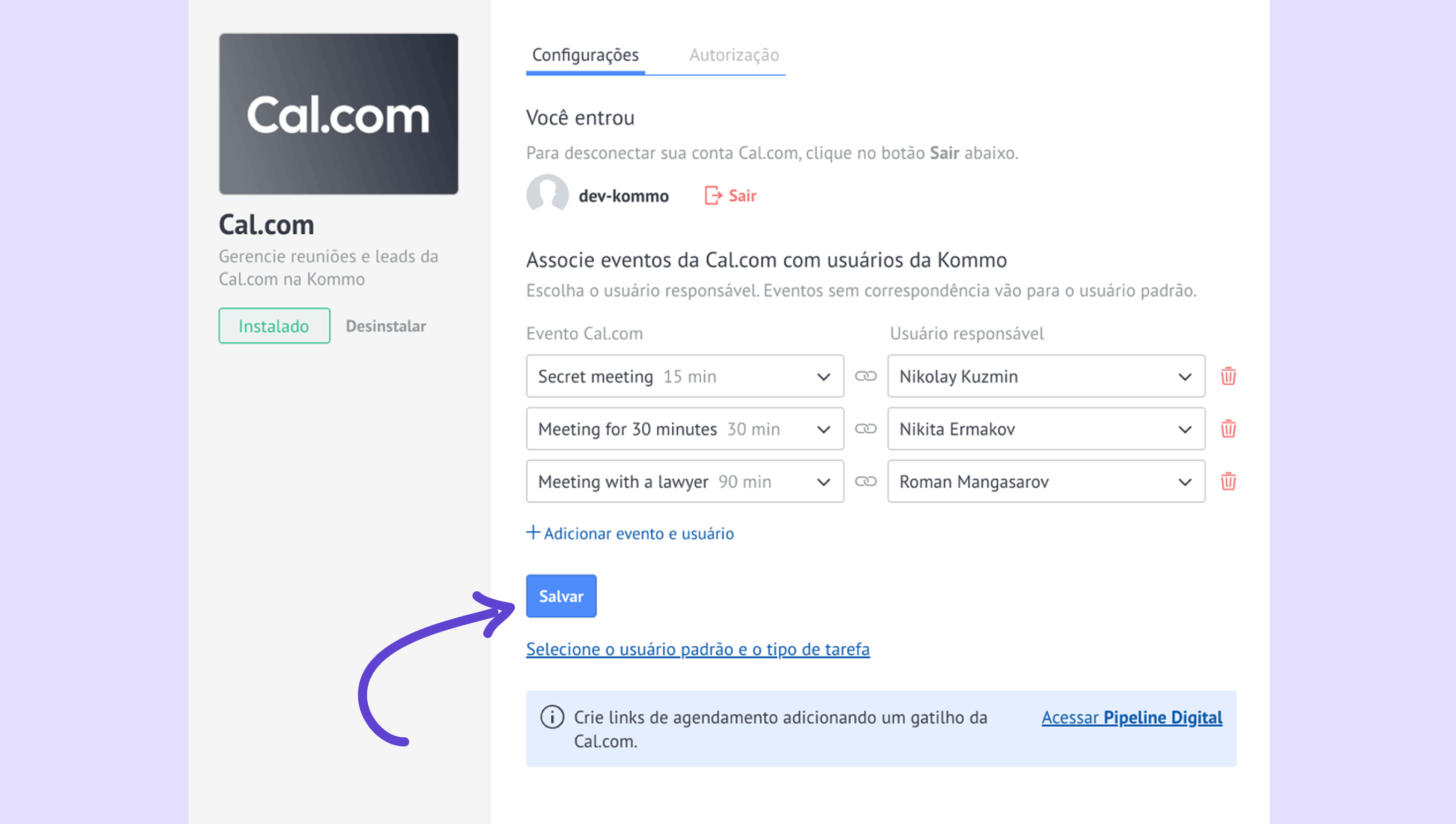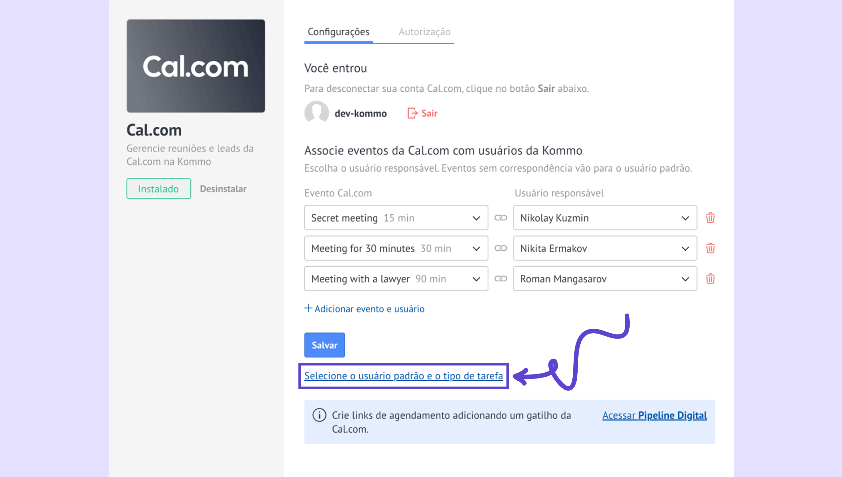 Após a integração estar conectada à sua conta Cal.com, você precisa configurá-la associando seus eventos. Associar o evento significa atribuir o usuário responsável na Kommo a cada evento da sua conta. Você também pode atribuir um usuário responsável padrão — um usuário da Kommo que será definido como responsável por todos os eventos que não forem associados manualmente.