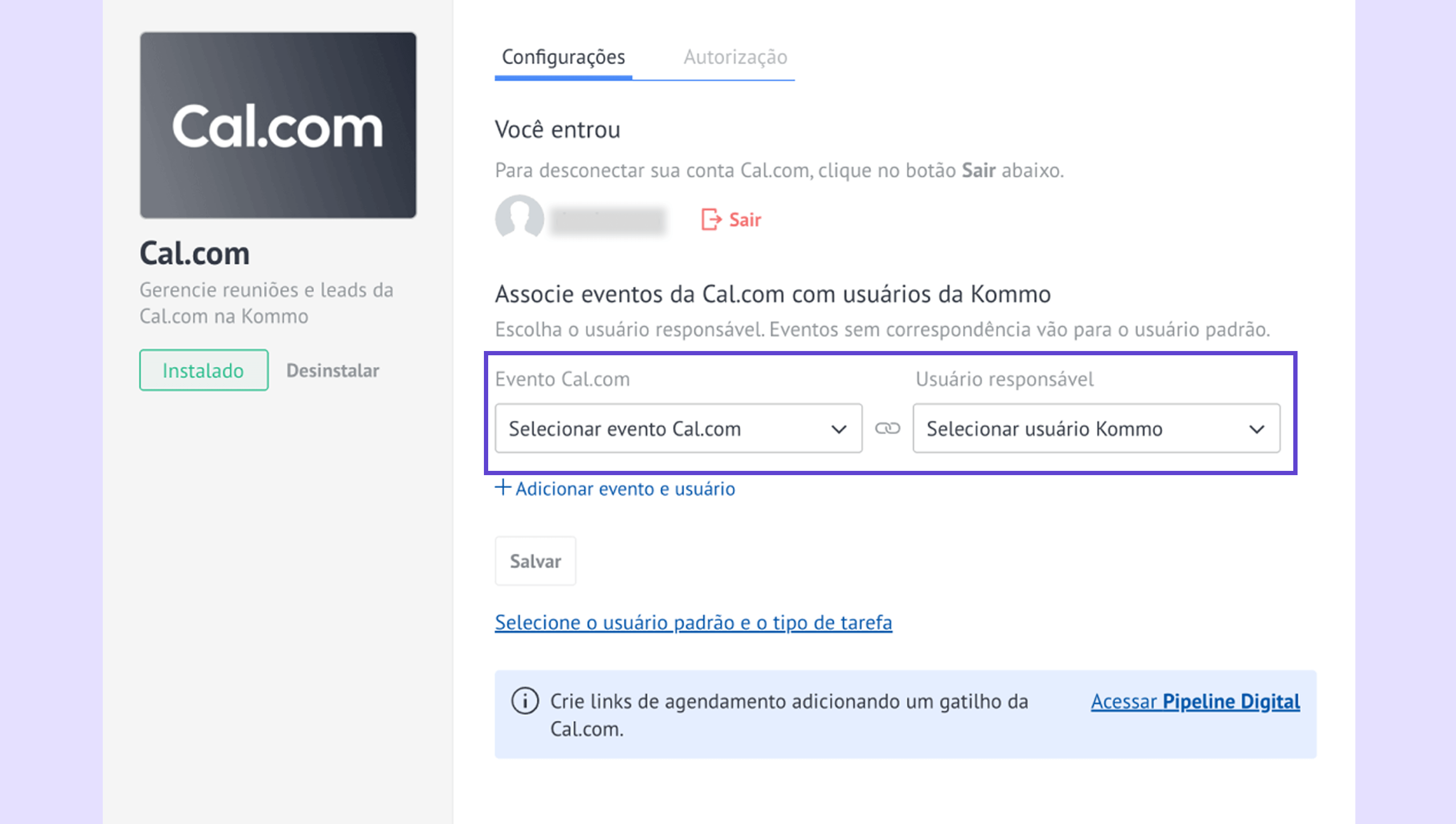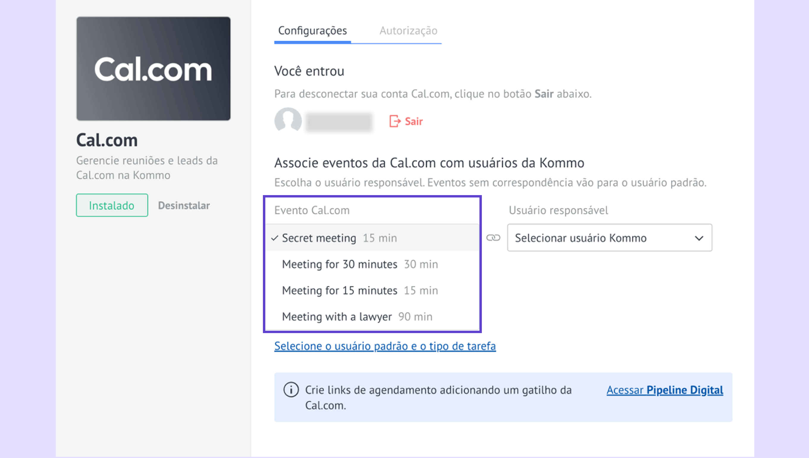 Para definir o gatilho, clique em Acessar pipeline digital no widget de integração da Cal.com.