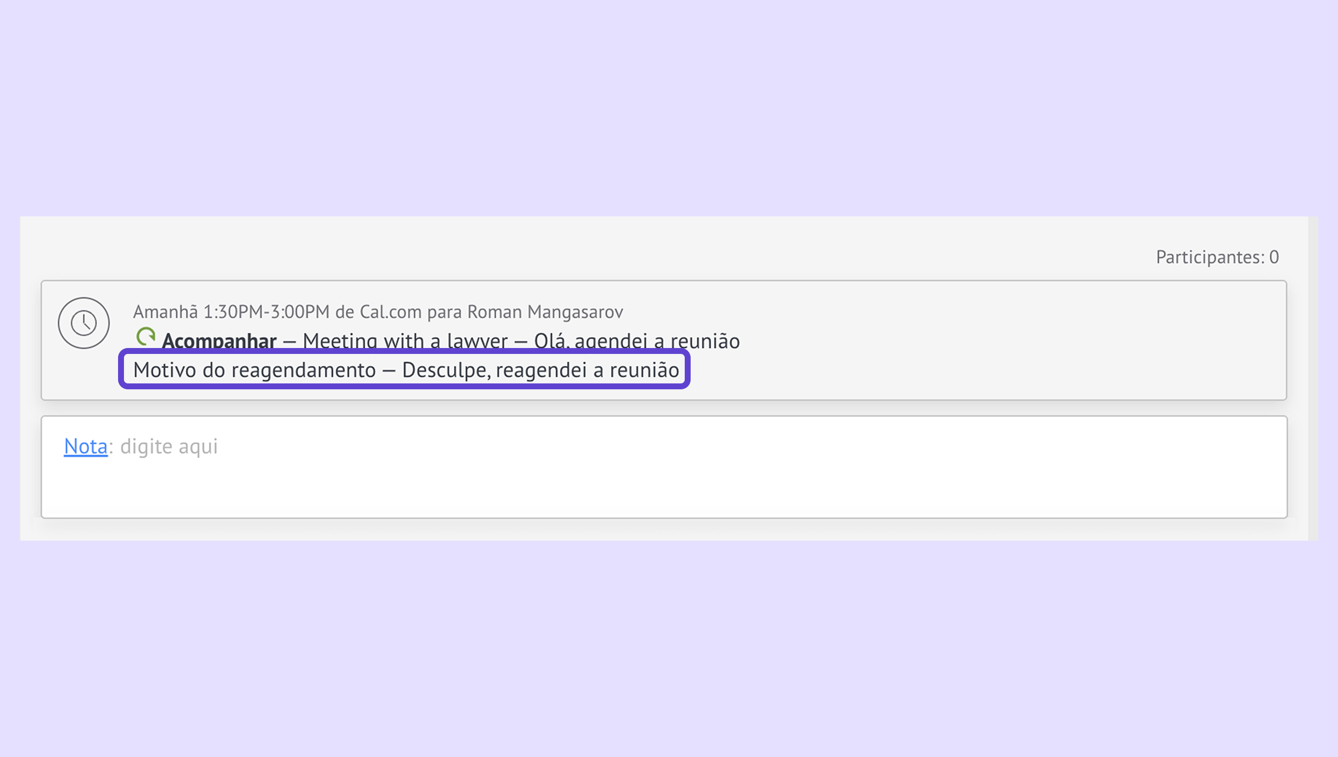 Se o cliente remarcar, o evento da Cal.com será transferido para a nova data e a tarefa na Kommo será atualizada automaticamente. A tarefa exibirá a nova data e hora, além de uma observação chamada Motivo do reagendamento na mensagem do cliente.