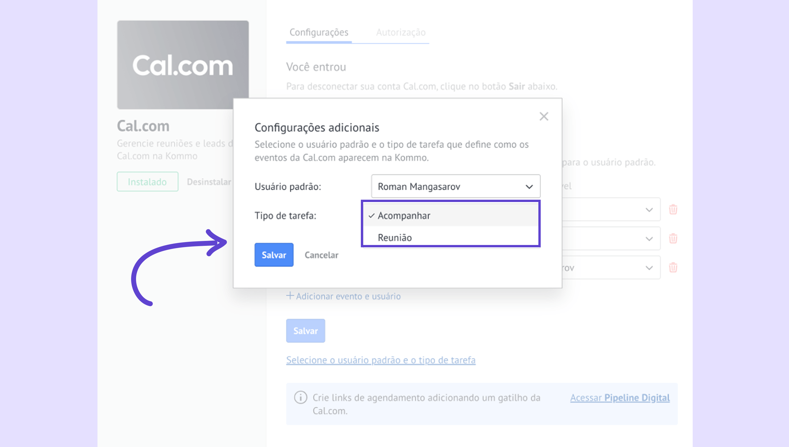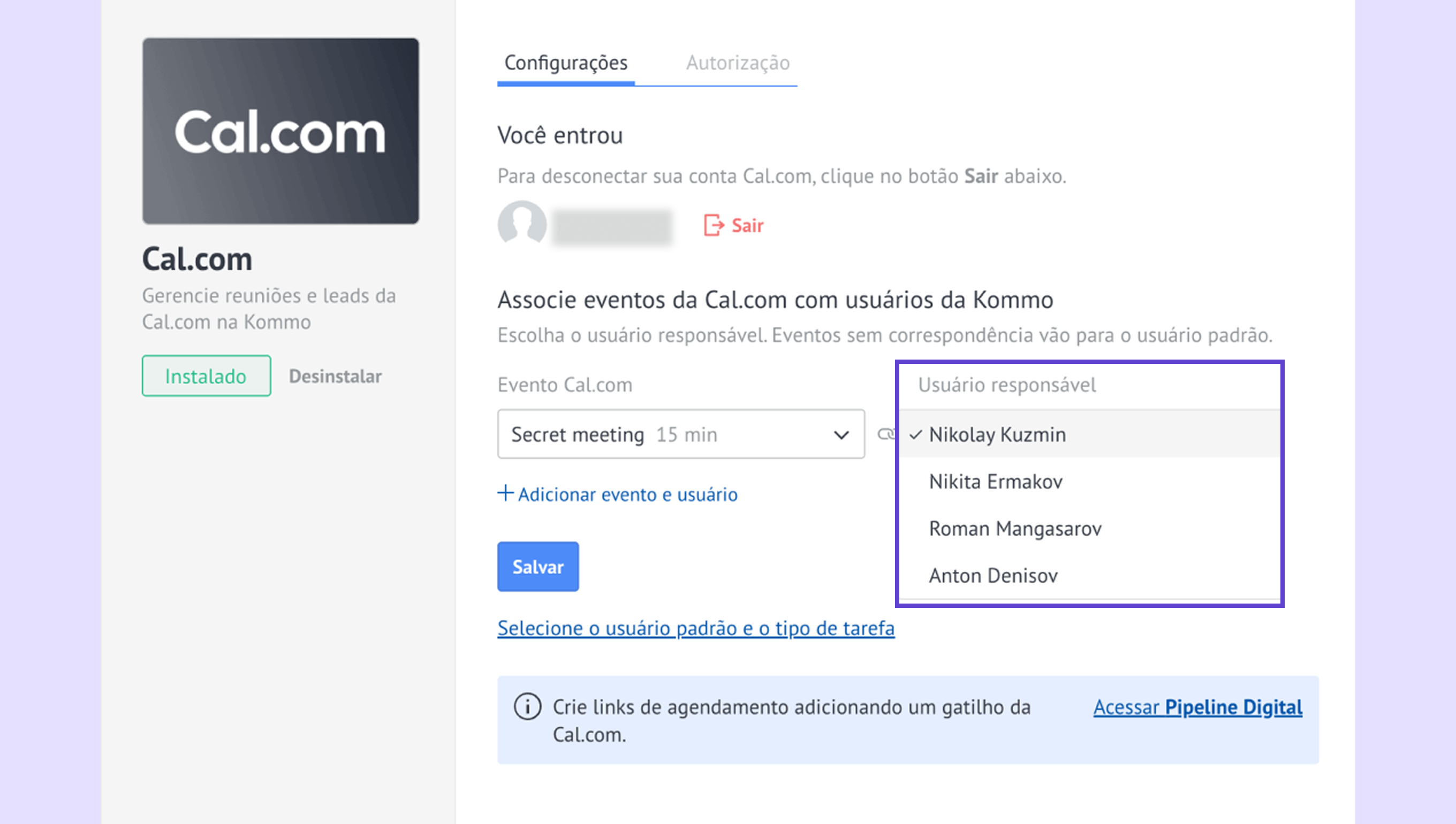 Abra o widget Cal.com na Kommo. Você verá duas colunas: Evento Cal.com e Usuário responsável.