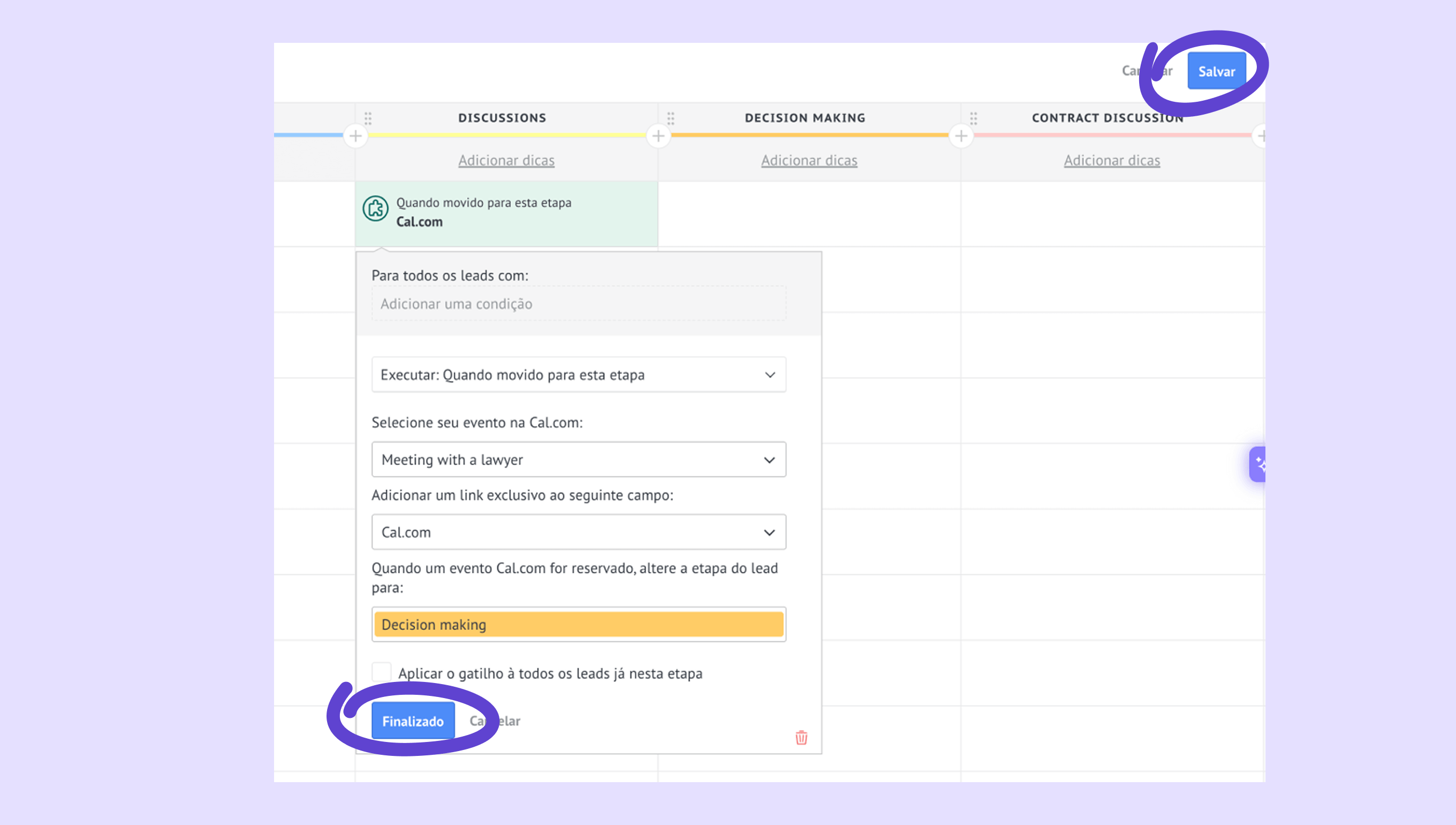 Para aproveitar ao máximo a integração, configure gatilhos em seus pipelines digitais. Esses gatilhos podem criar automaticamente um link de reserva que você pode compartilhar com os clientes, permitindo que eles confirmem, remarquem ou cancelem eventos com apenas alguns cliques.