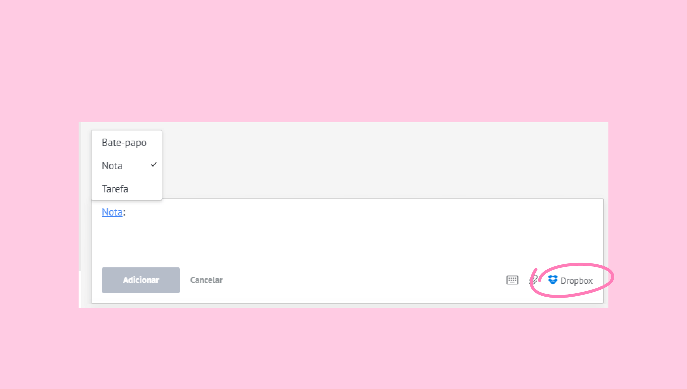 Na caixa de chat, selecione Nota e clique no ícone do Dropbox. Escolha o arquivo que deseja anexar.