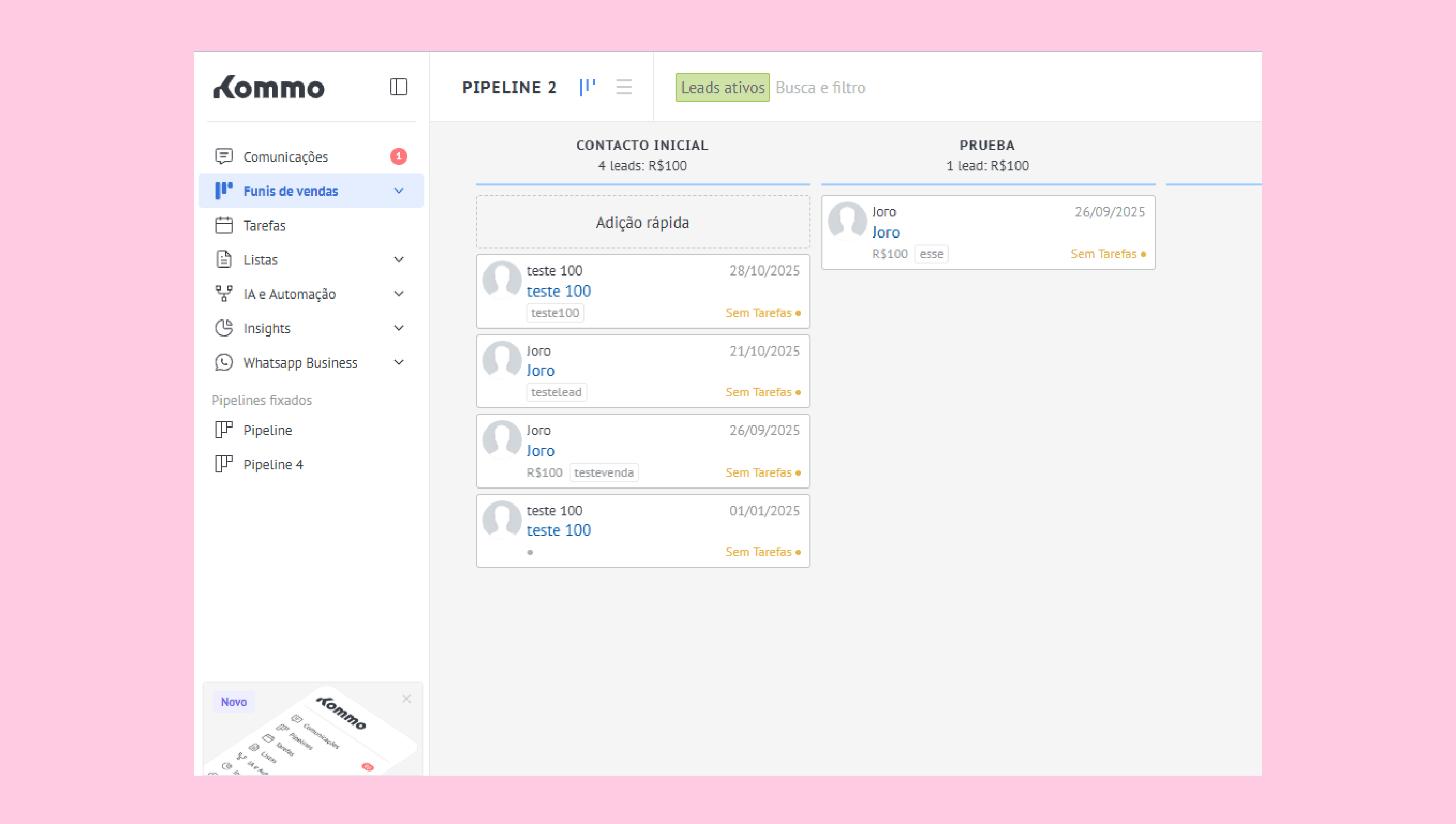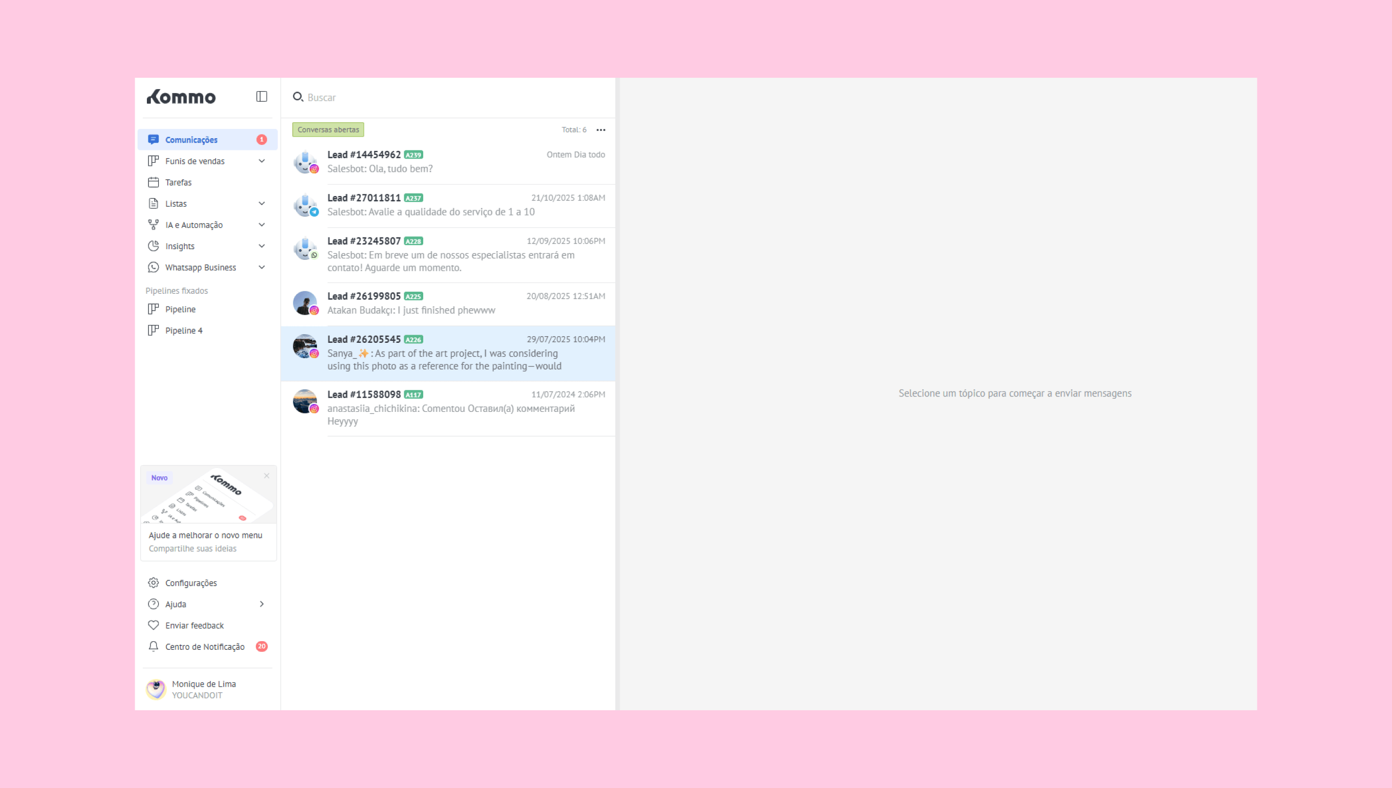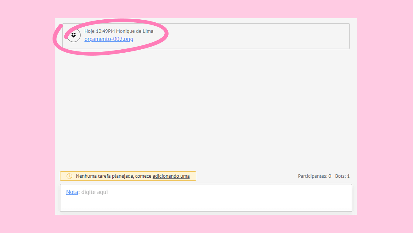 - Acesse um pipeline e abra o chat de qualquer lead no qual você deseja fazer o upload de um arquivo.