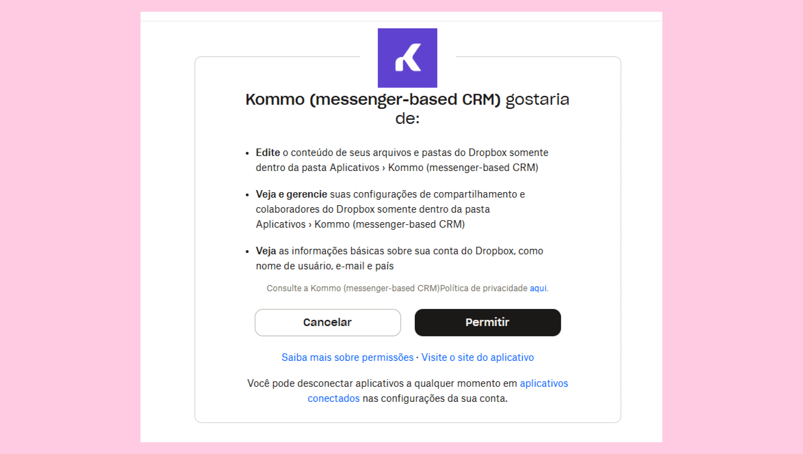 Após a conexão, a Kommo cria automaticamente uma pasta da Kommo na sua conta do Dropbox — e você já pode começar a fazer uploads!