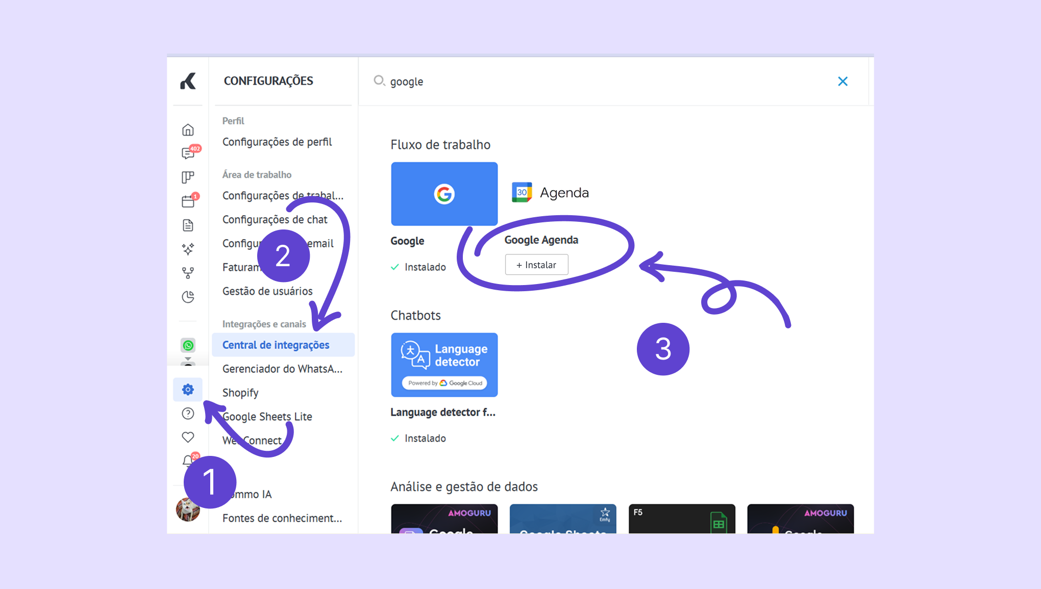 Acesse Configurações → Central de integrações → procure por Google Agenda. Clique em Instalar.