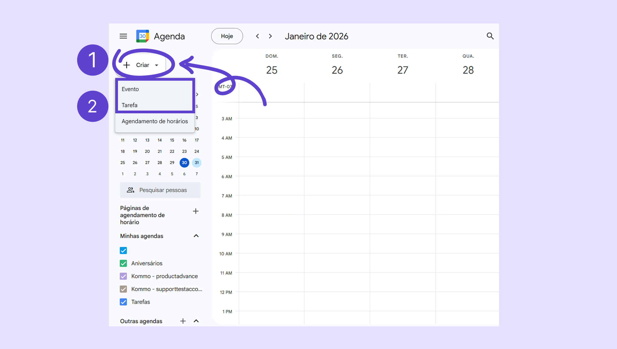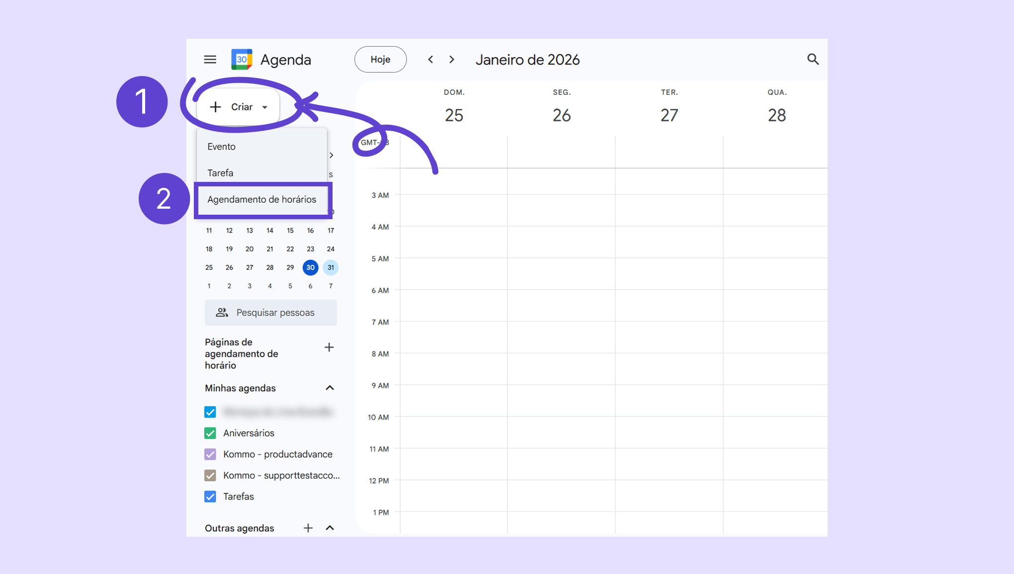 Acesse o Google Agenda → clique em Criar.