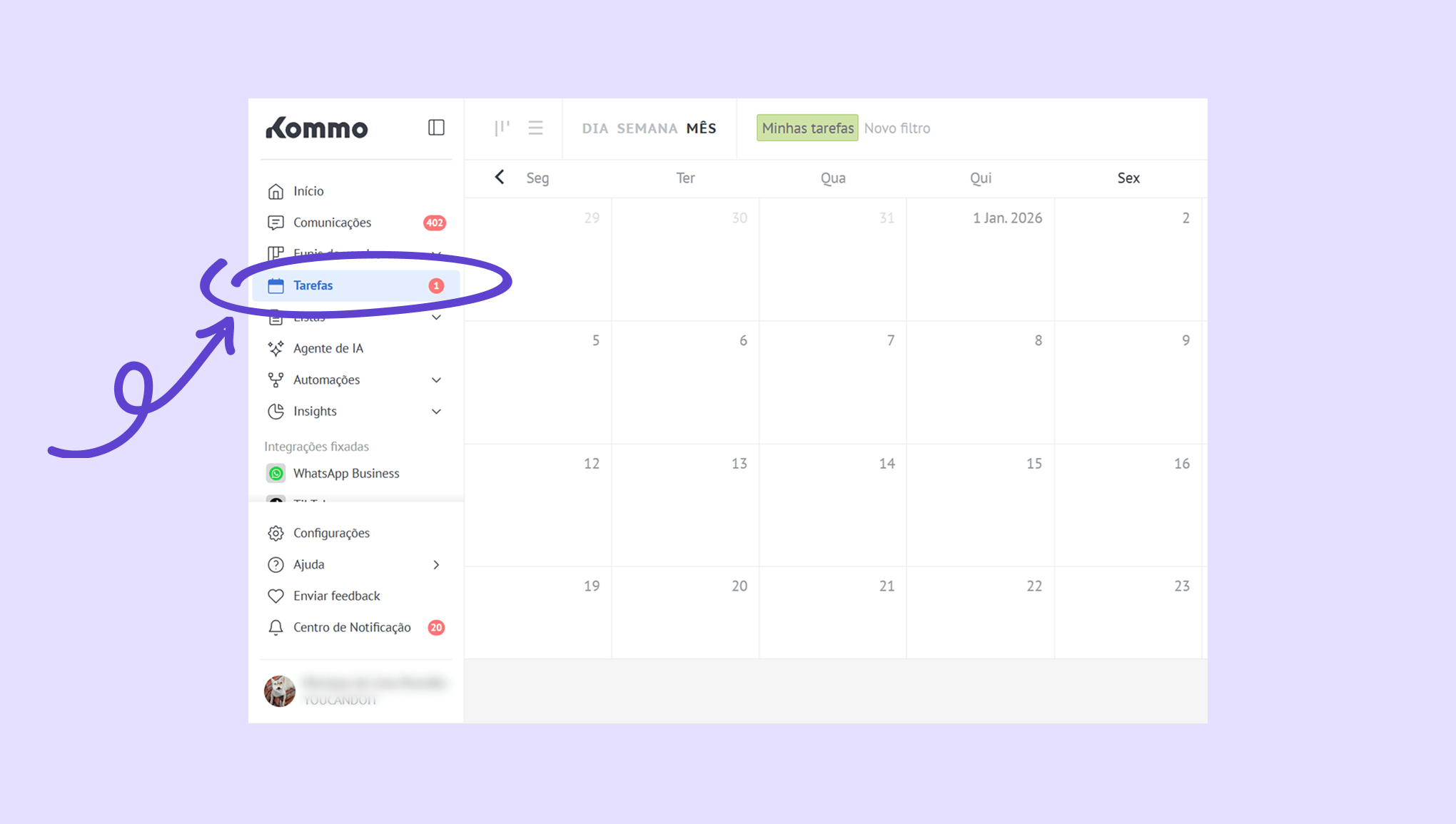 Observação: os eventos e tarefas sincronizados só são visíveis para o usuário Kommo selecionado.