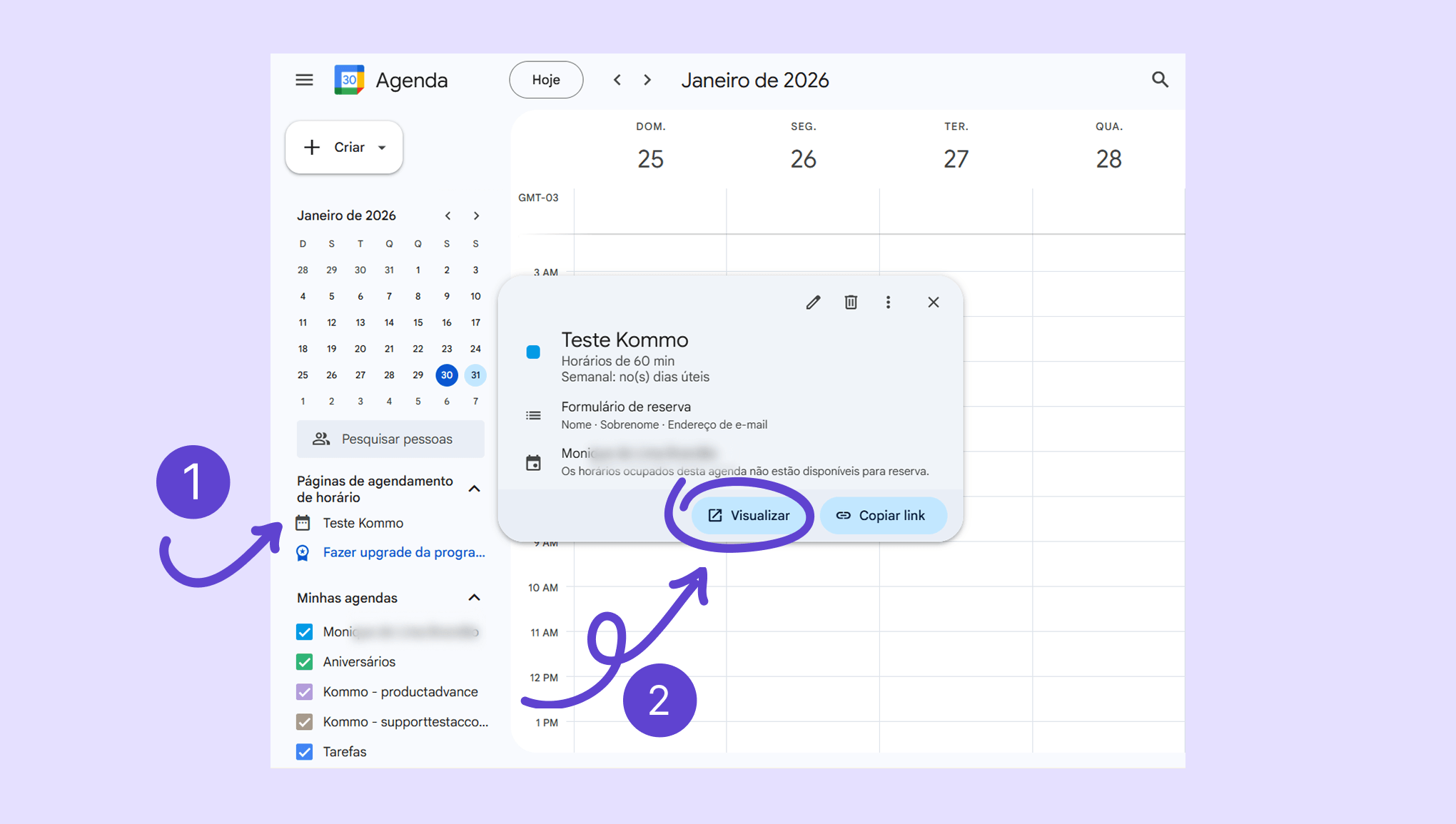 Vá até a seção Páginas de agendamento de horário, clique na sua página → clique em Visualizar.