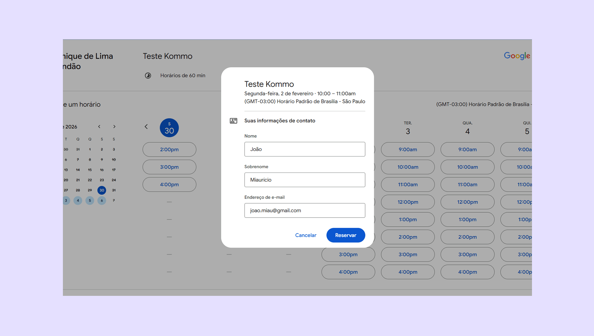 - Selecione um horário e agende um horário de teste (como se você fosse um lead).
