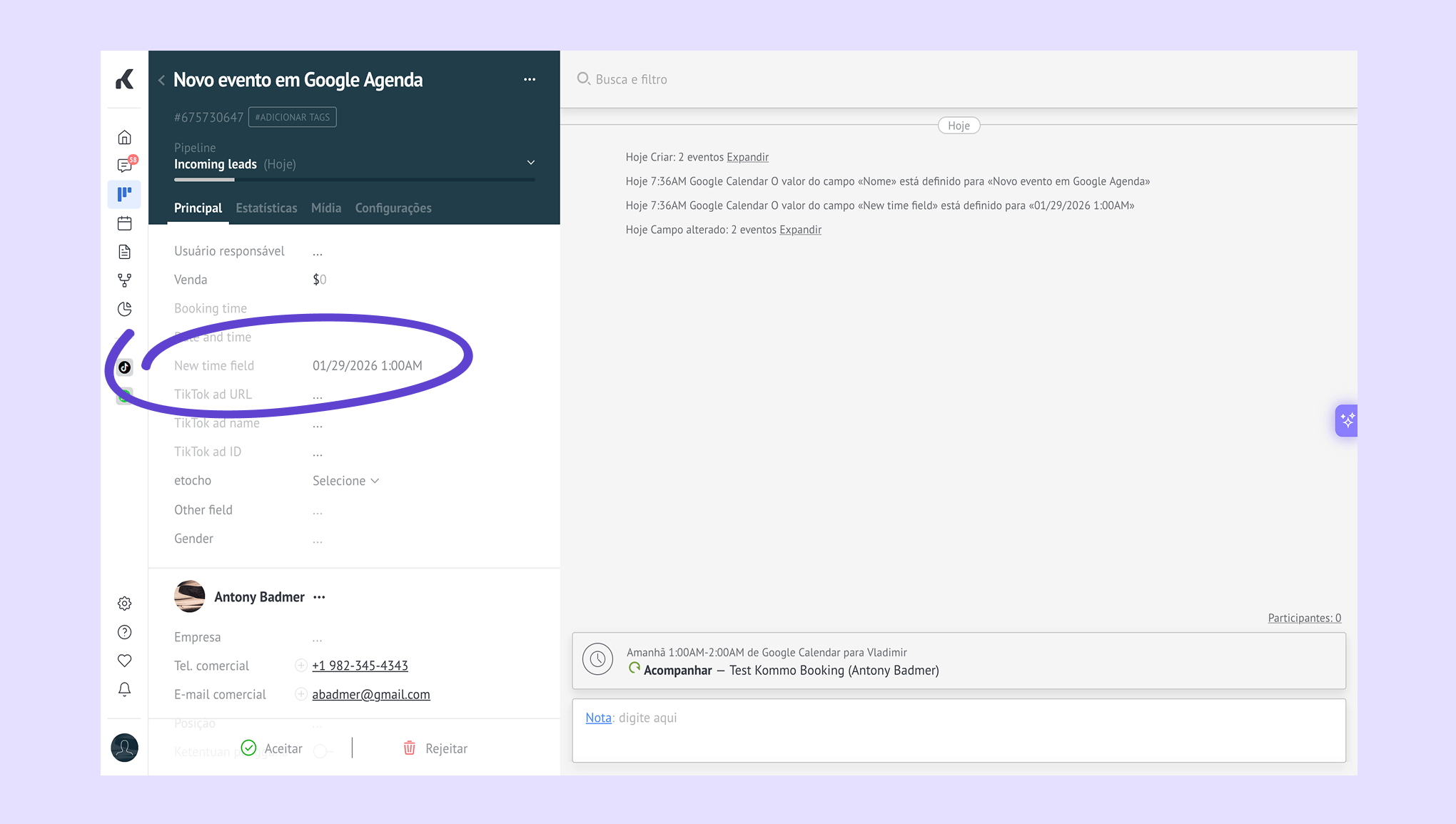 A data e a hora selecionadas na sua página de agendamento de horários aparecem no cartão do lead.
