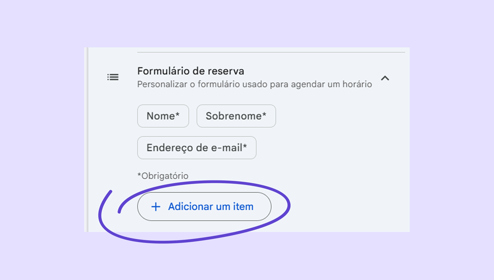 Na seção Formulário de reserva, escolha quais informações os clientes precisam fornecer para agendar uma consulta. Por padrão, isso inclui nome, sobrenome e endereço de email. Você também pode solicitar um número de telefone ou adicionar campos personalizados clicando em Adicionar um item.