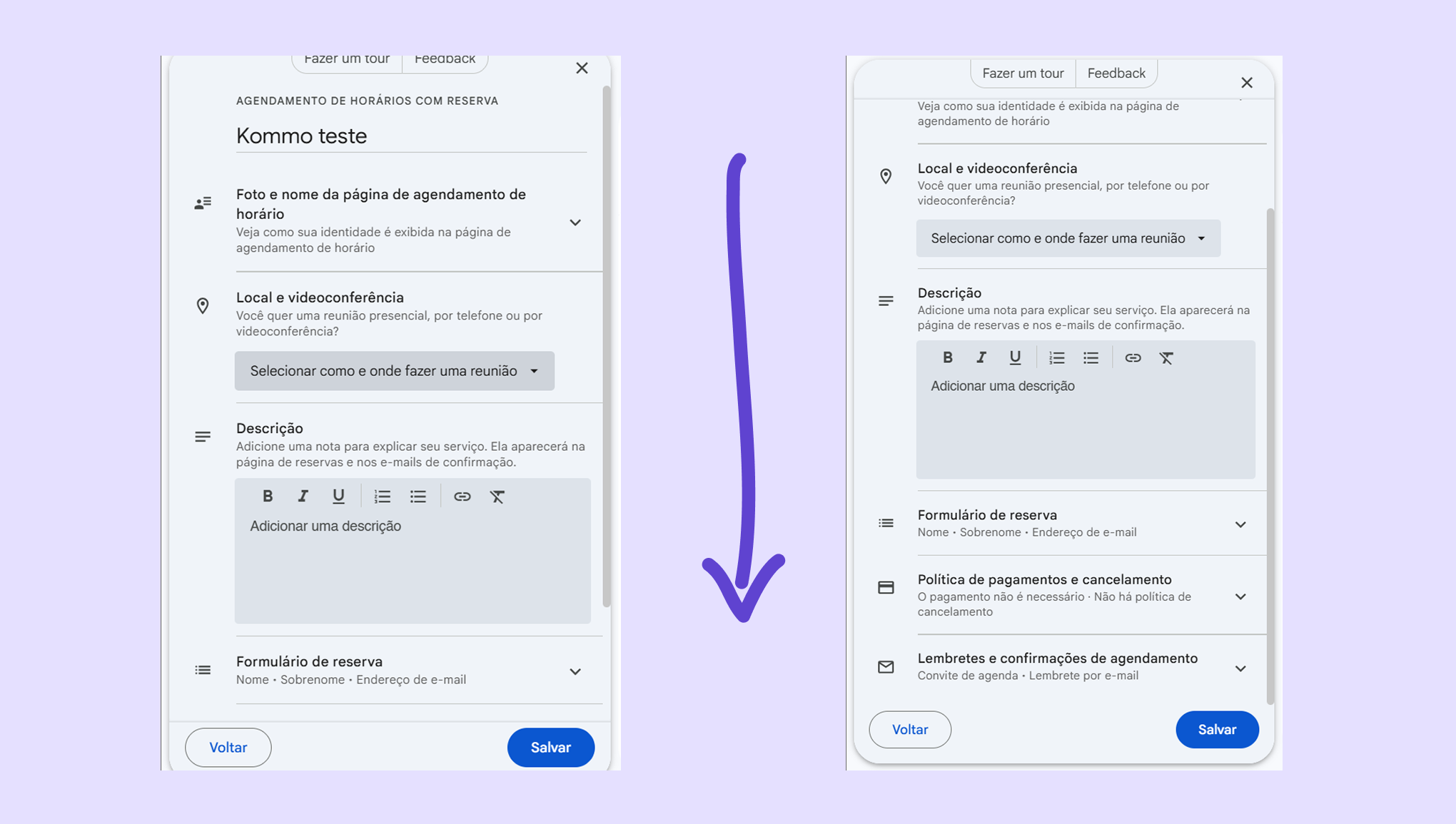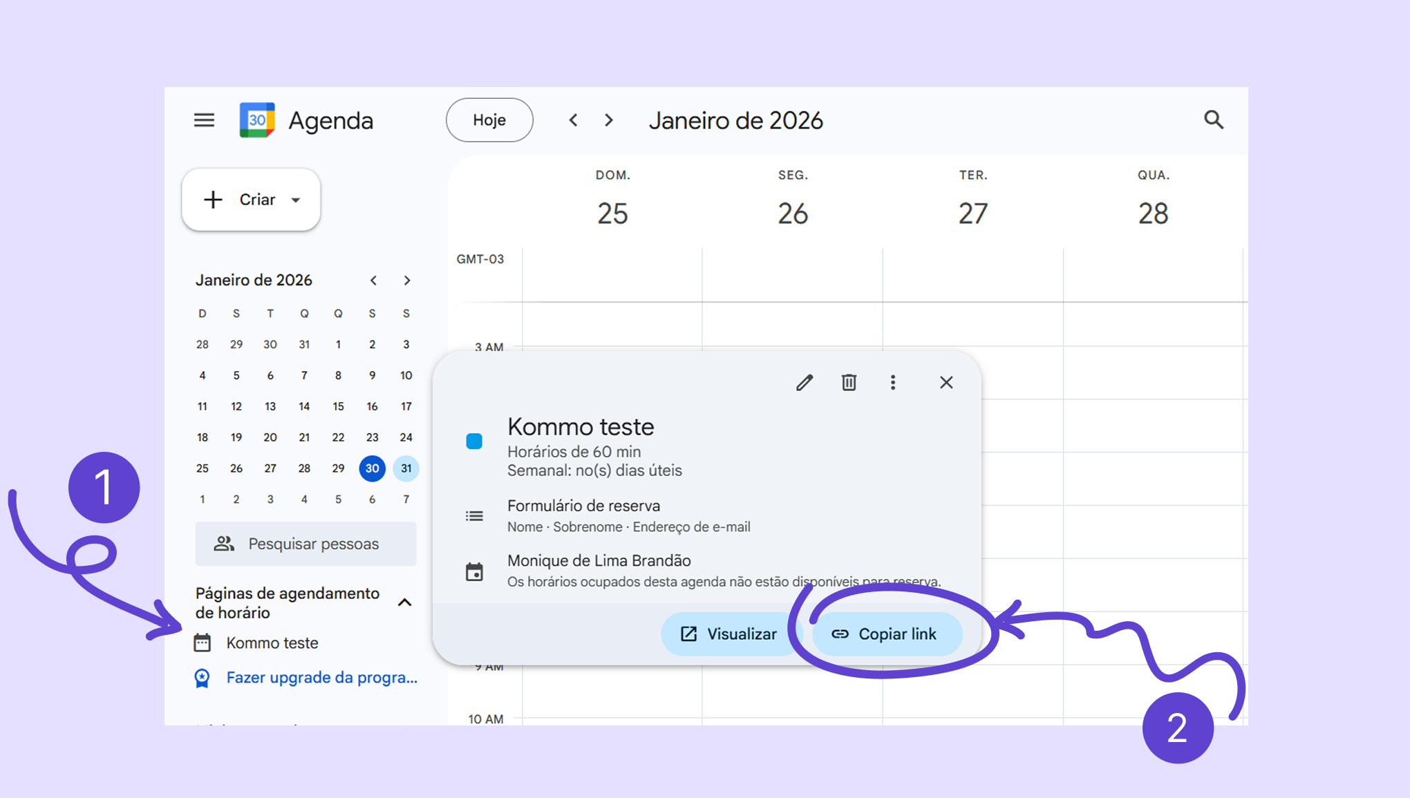 Uma das funcionalidades do Google Agenda que você pode integrar à Kommo é o Agendamento de horários. Ele permite criar uma página de reserva onde os clientes podem escolher a data e o horário mais convenientes para eles.