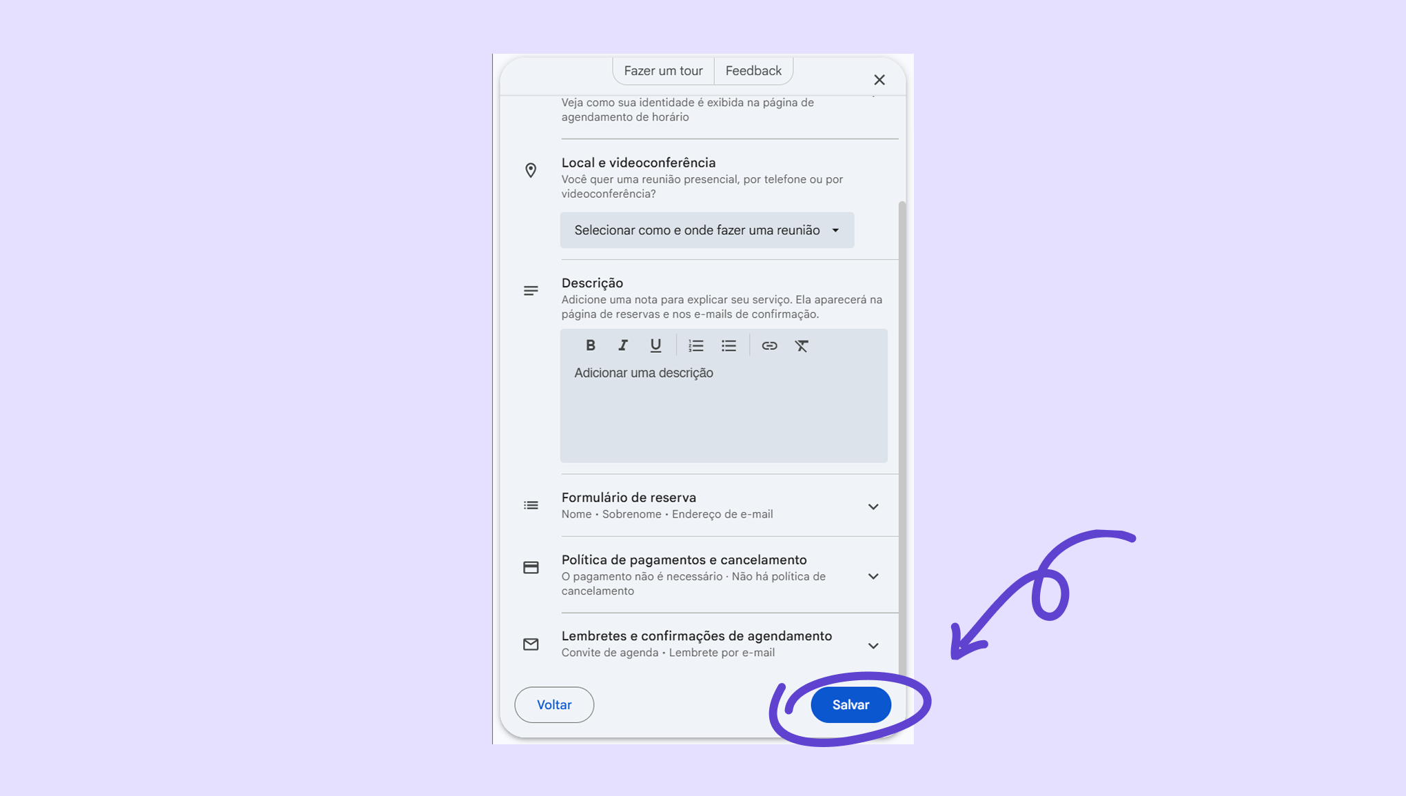 Título do agendamento – O nome que aparece na sua página de agendamento (por exemplo: “Horários disponíveis para agendamentos no Salão X”).