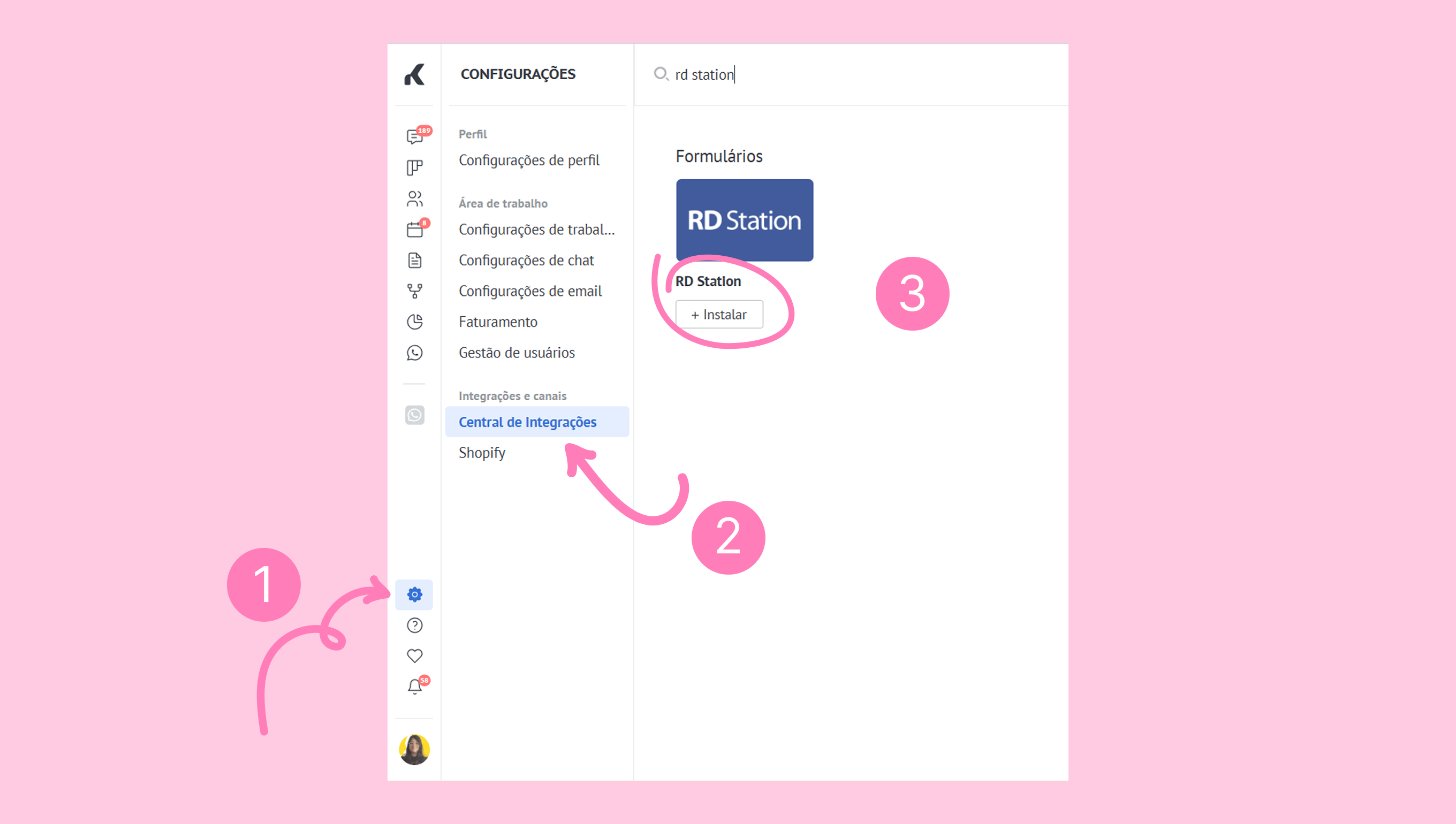 Na Kommo, acesse Configurações → Central de integrações → procure por RD Station.