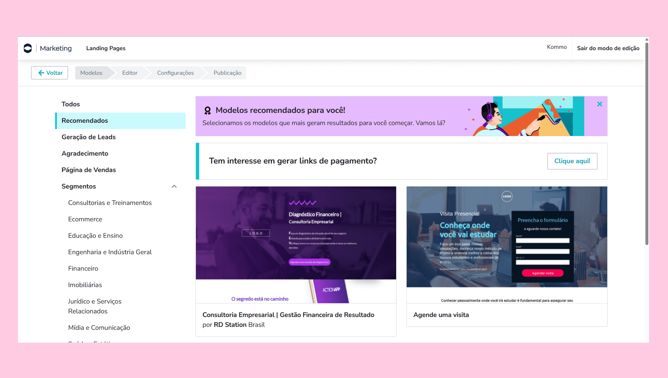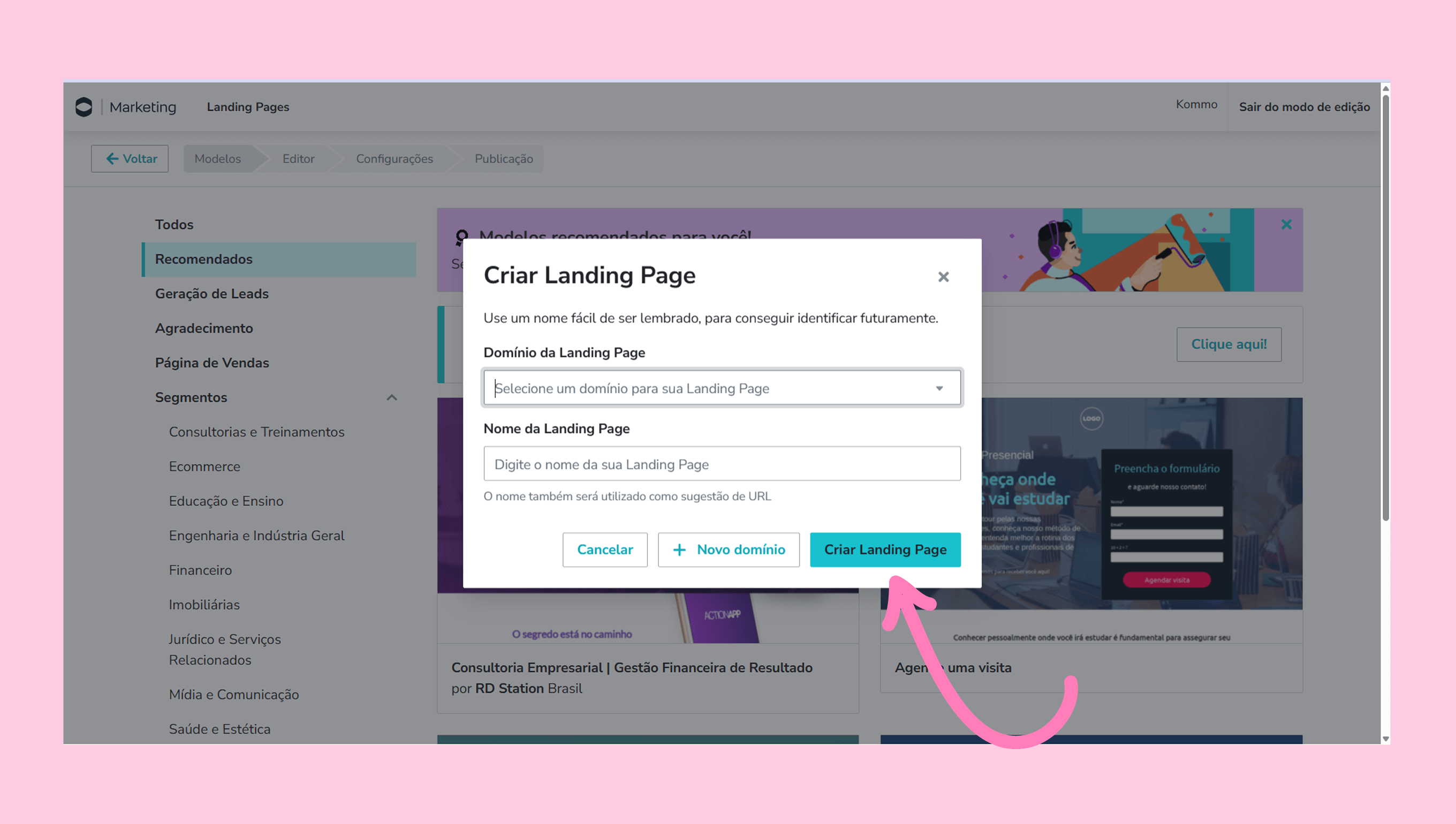 Clique em Criar Landing Page para criar uma nova.