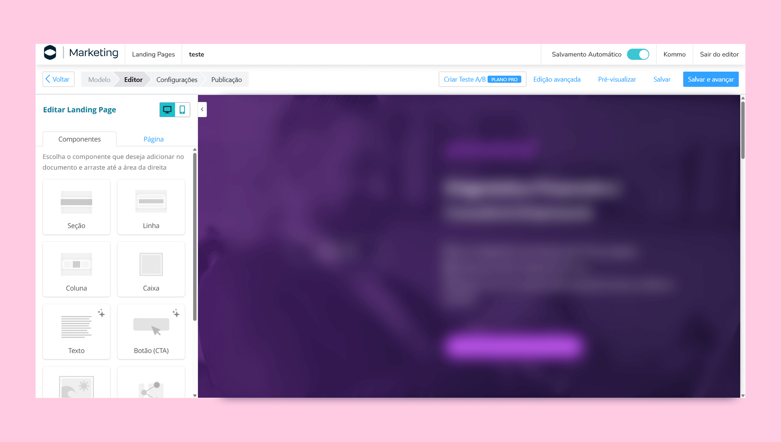 No editor, atualize o texto, adicione componentes a partir do menu à esquerda e clique em Salvar e avançar quando terminar.