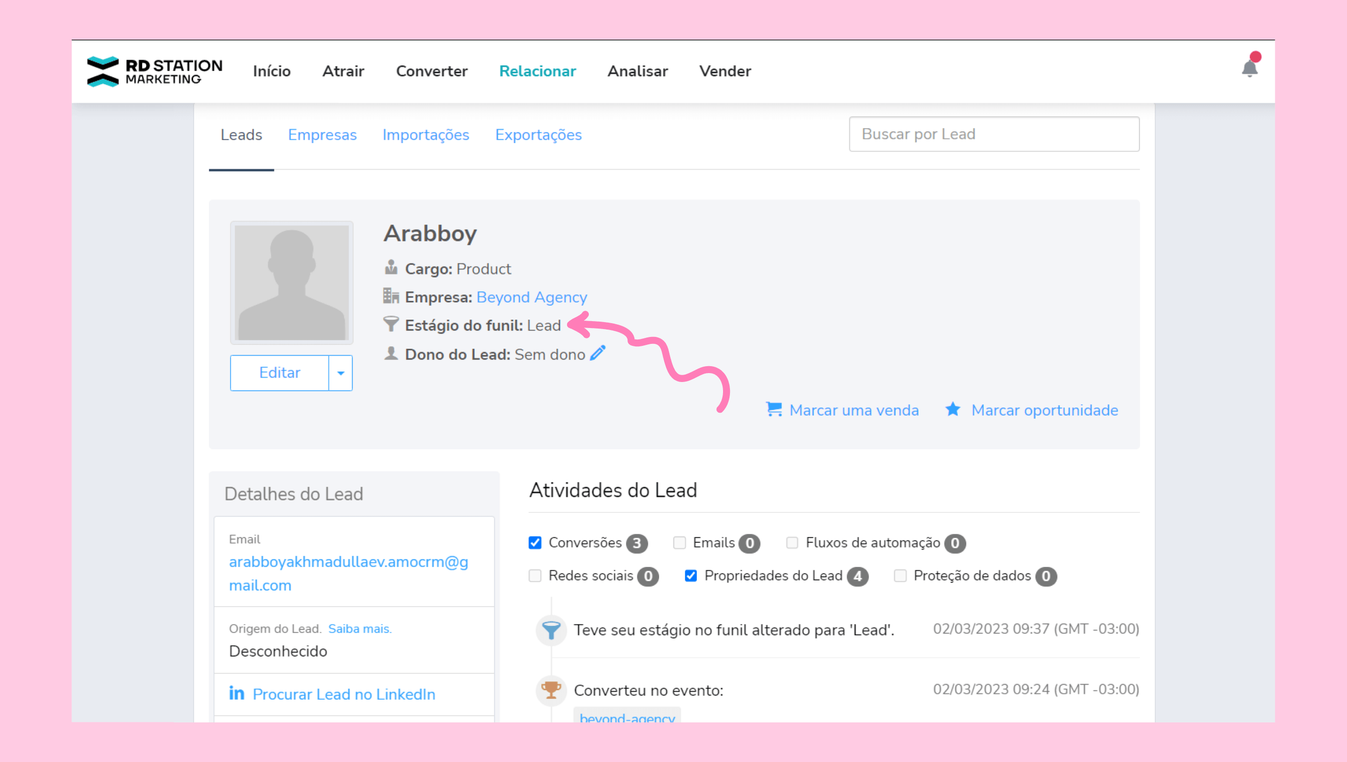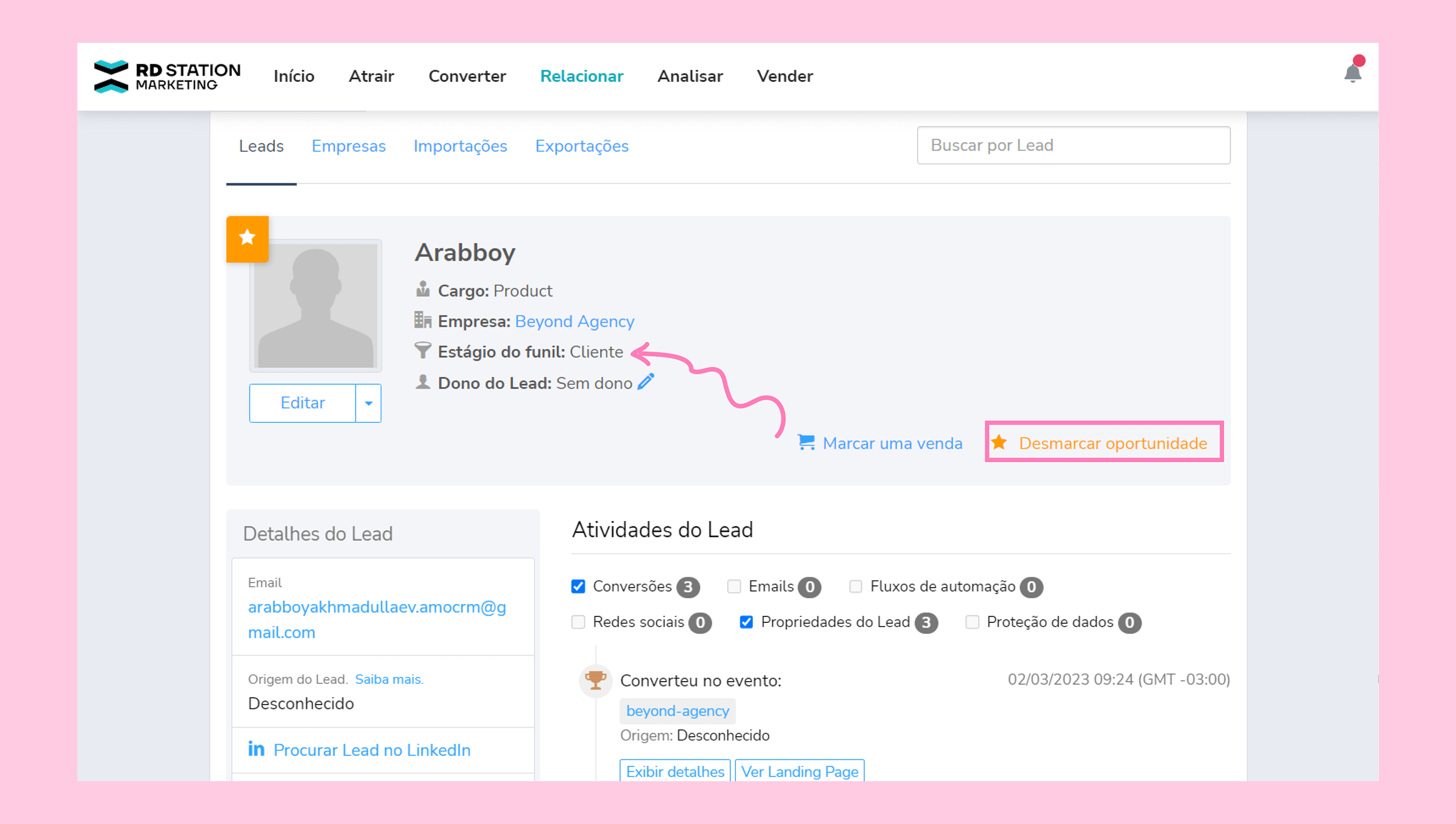 Mover para Fechado-Perdido → O lead permanece como Lead na RD Station, se a tag Oportunidade tiver sido adicionada anteriormente, ela será removida.