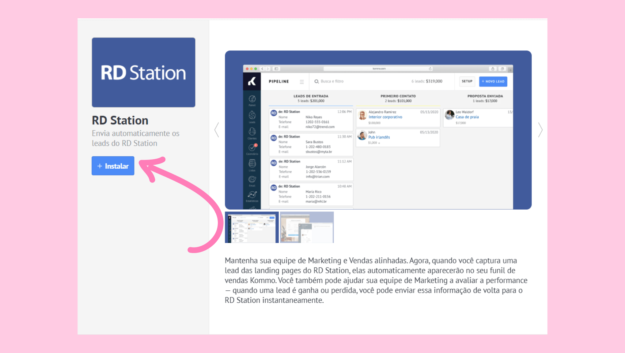 Ao integrar a RD Station com a Kommo, você conecta suas equipes de marketing e vendas. Os leads das landing pages da RD Station são adicionados automaticamente à Kommo, permitindo que os representantes façam o acompanhamento instantaneamente. À medida que os leads avançam pelas etapas na Kommo, seu status é atualizado na RD Station, mantendo ambas as plataformas sincronizadas e ajudando sua equipe a monitorar o desempenho, mensurar o ROI (Retorno sobre Investimento) e converter mais leads.