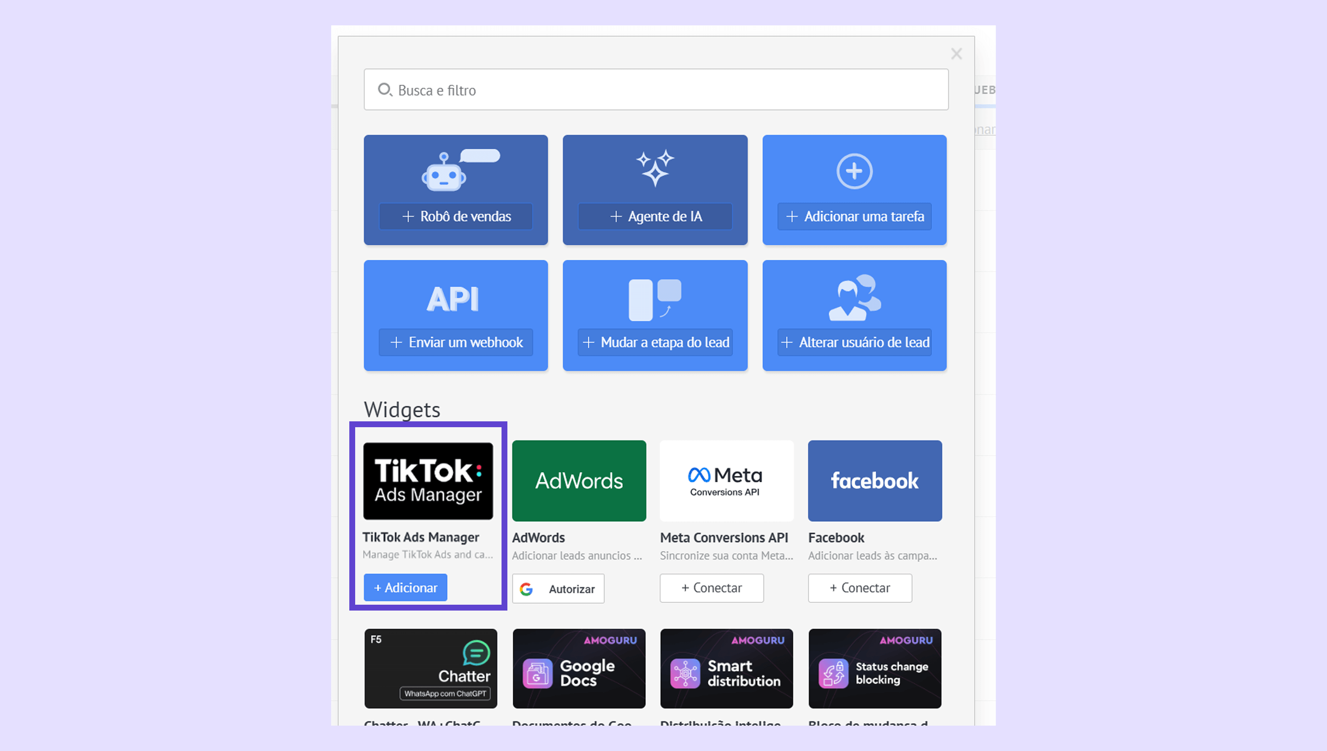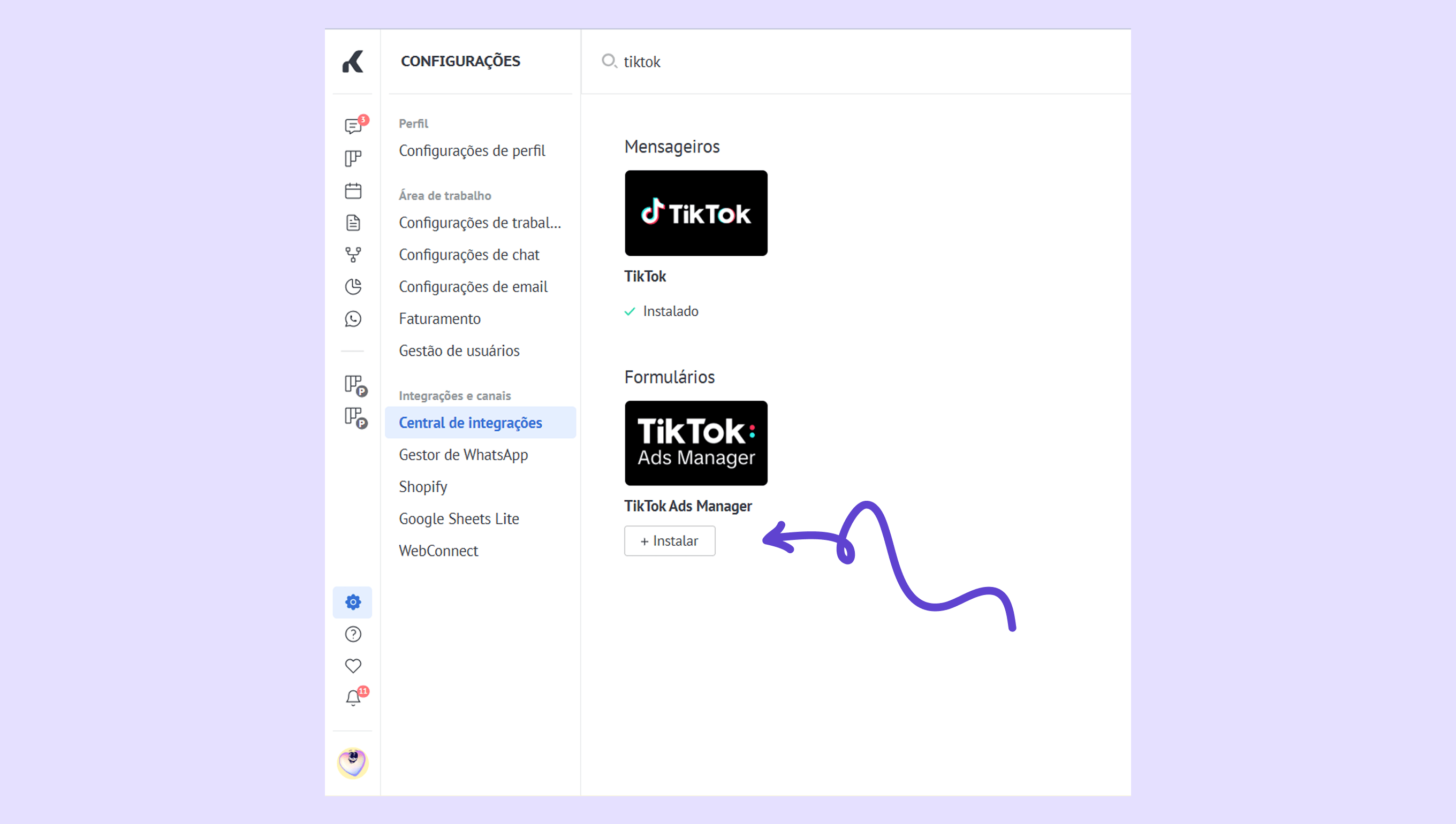 Acesse a Central de integrações → pesquise pelo TikTok Ads Manager.