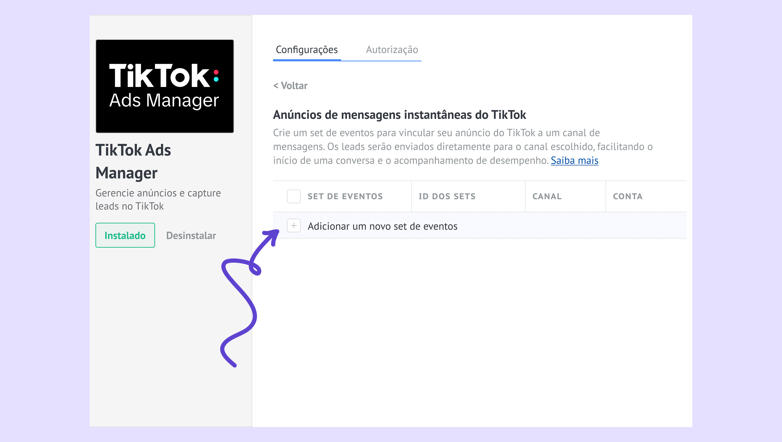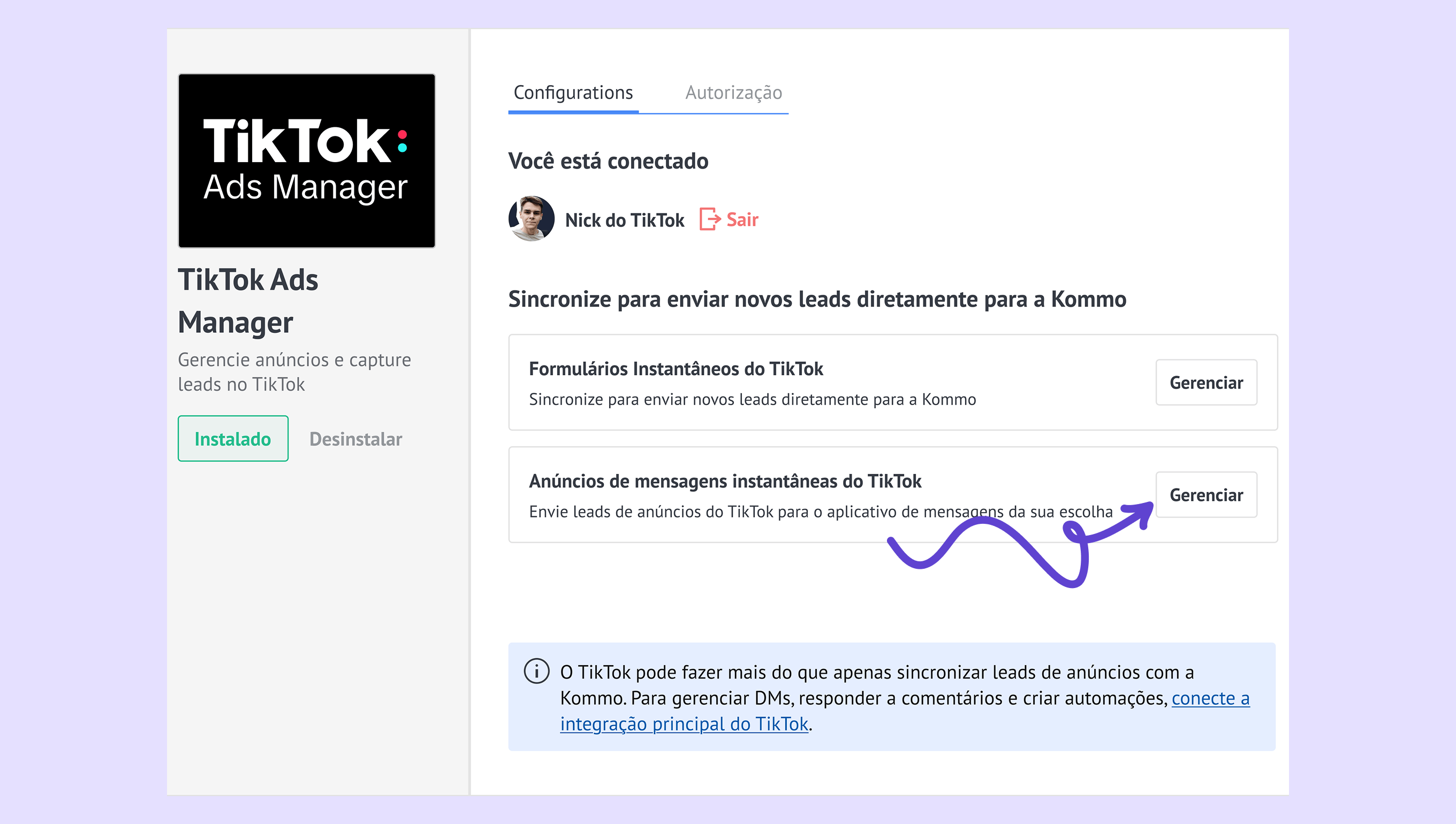 Instalou e conectou a integração do TikTok Ads Manager na Kommo.