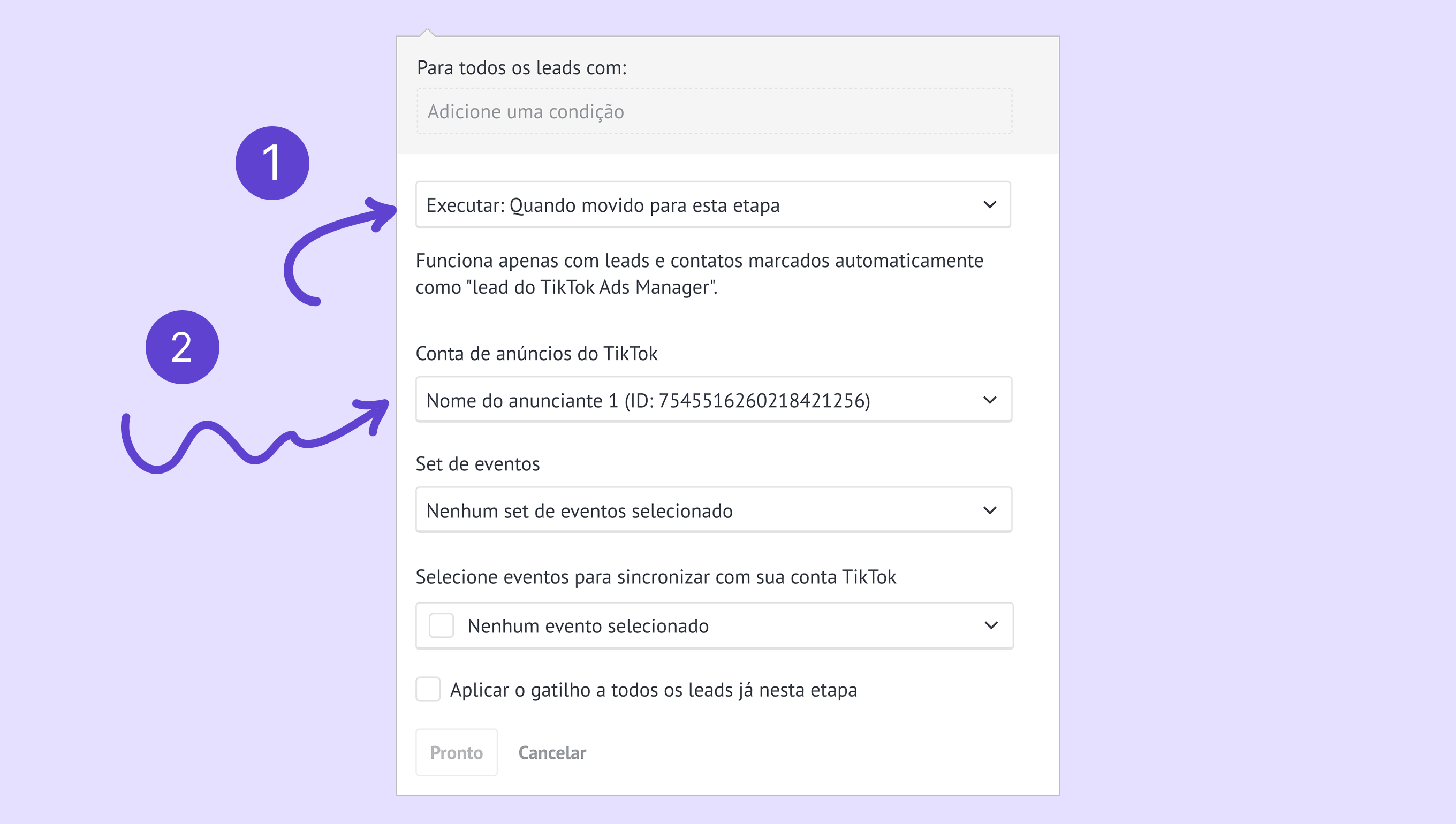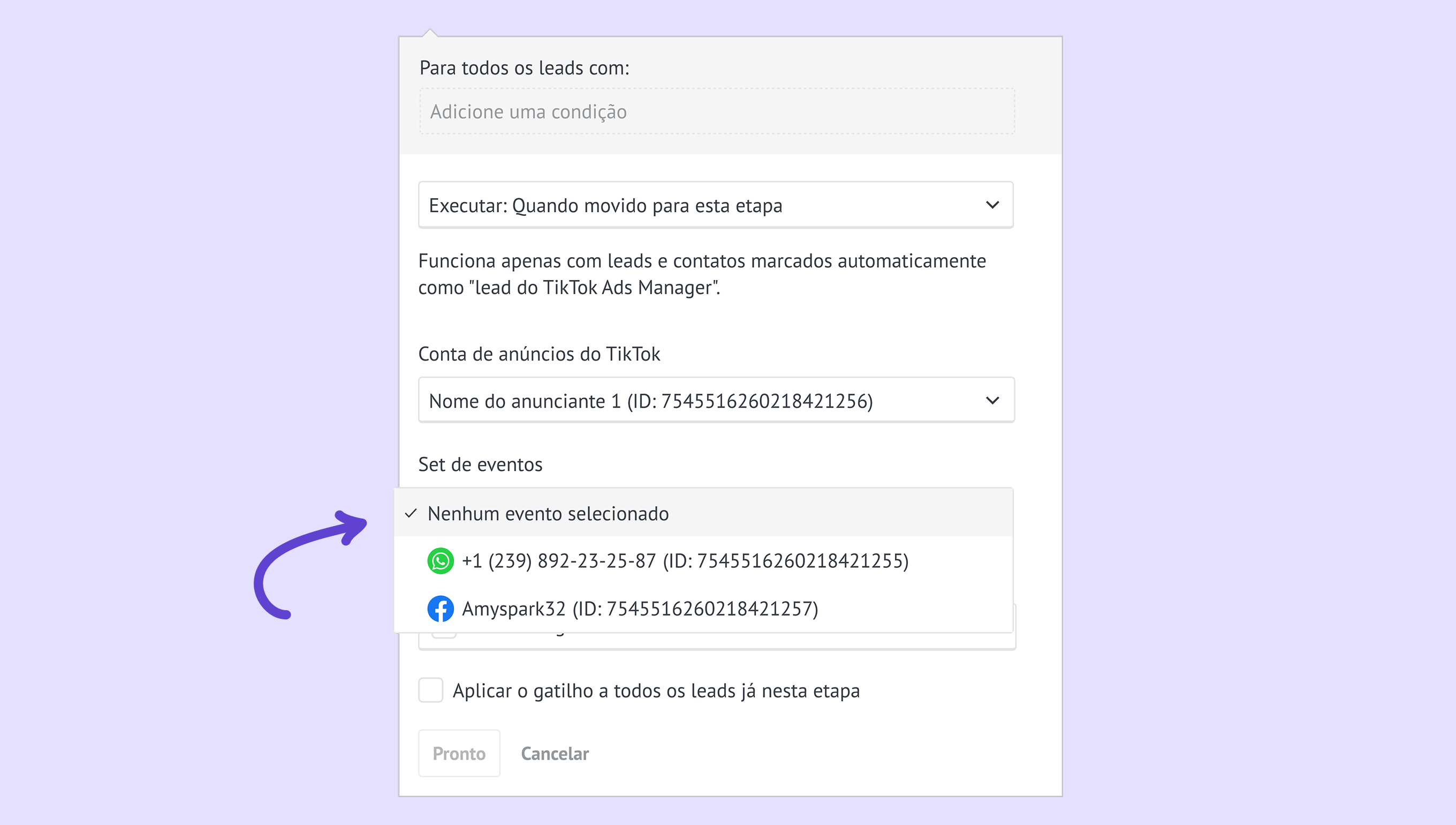 Escolha uma condição de acionamento (por exemplo, Após mover para esta etapa) e selecione uma conta de anúncios.