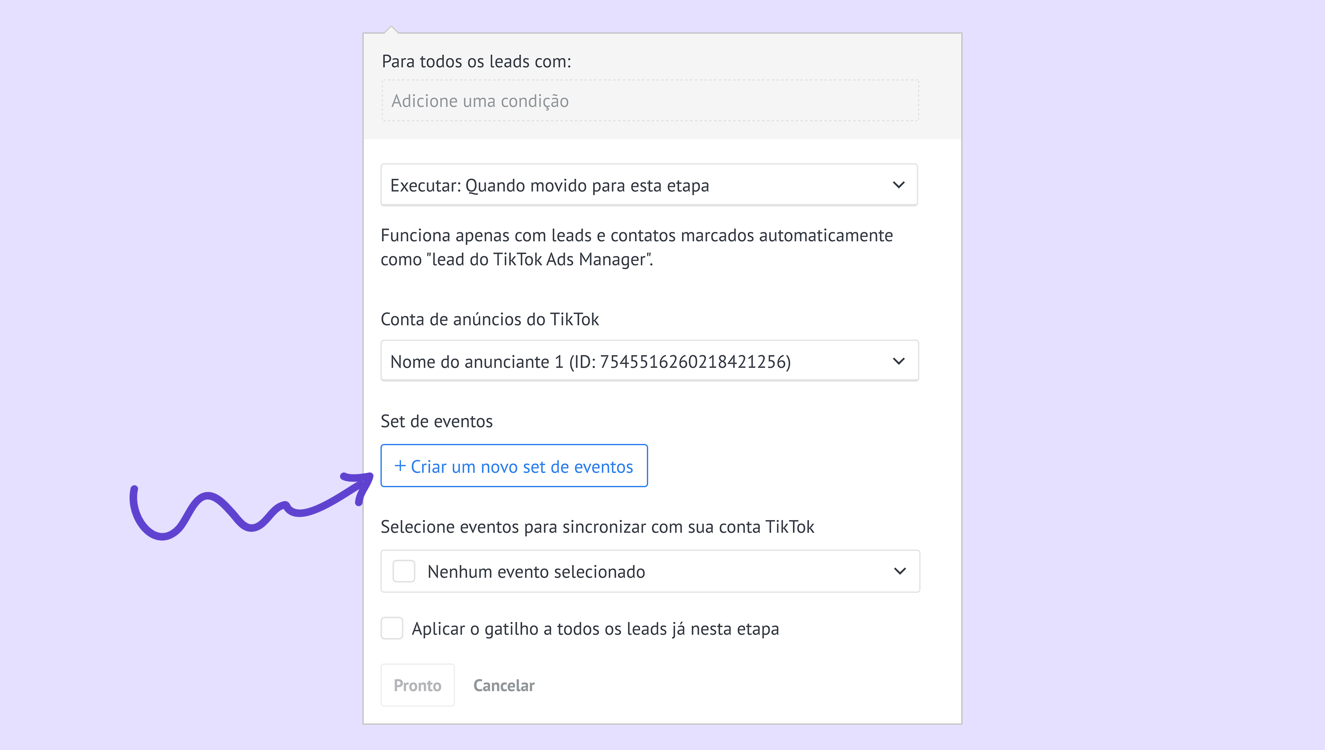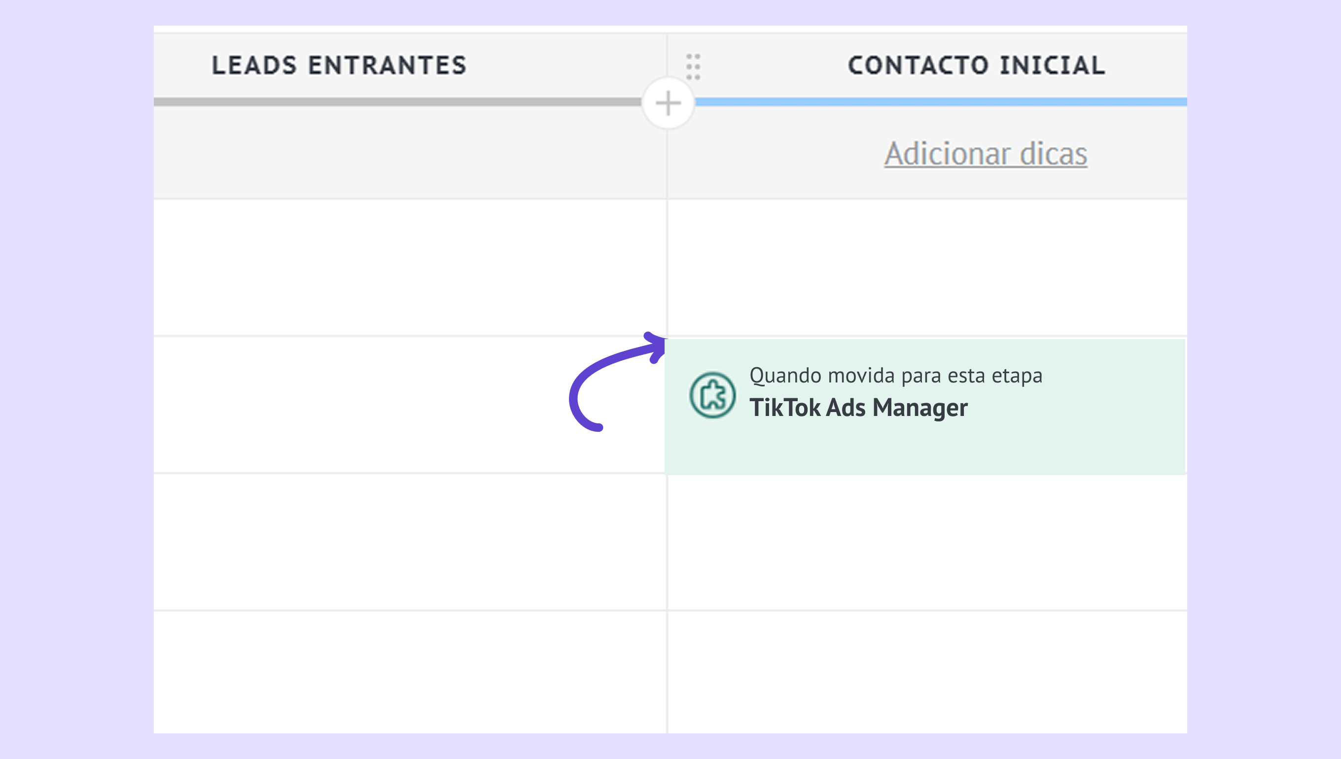 Você pode enviar eventos automaticamente para o TikTok usando gatilhos em seu pipeline digital. Isso ajuda a sincronizar mais ações entre a Kommo e o TikTok, melhorando o rastreamento e o desempenho dos anúncios.