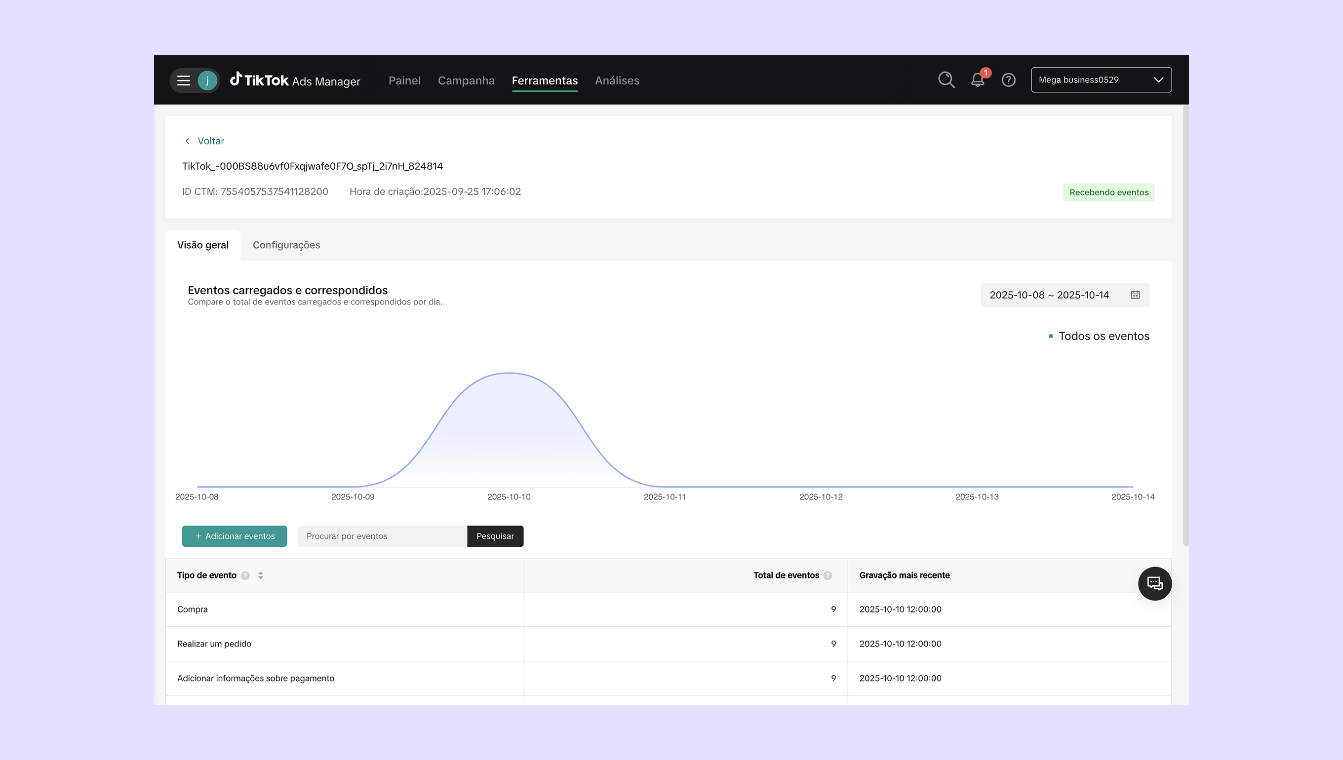 Assim que seus eventos começarem a ser enviados, você poderá verificar facilmente o desempenho deles nos Anúncios do TikTok: