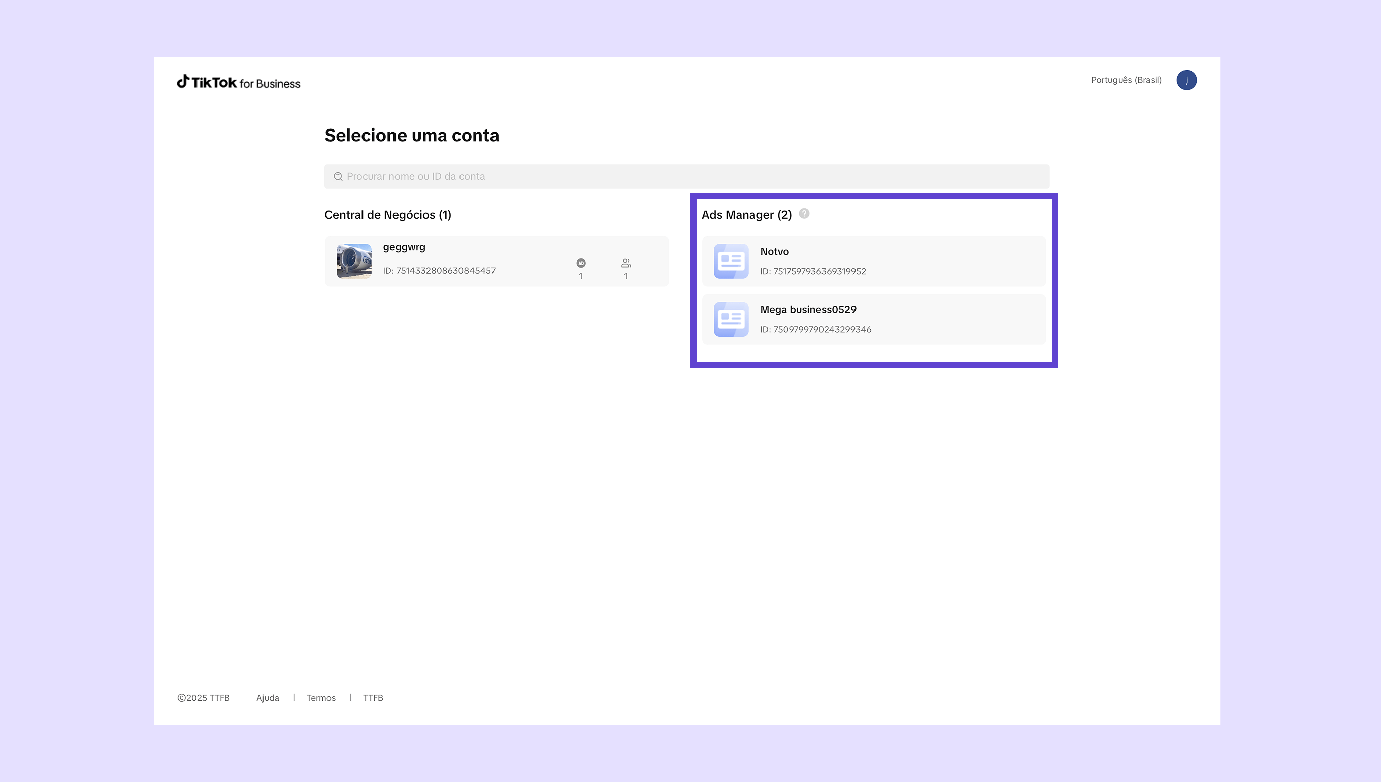 Faça login no seu TikTok Ads Manager e selecione a conta do TikTok for Business que você usará para anúncios.