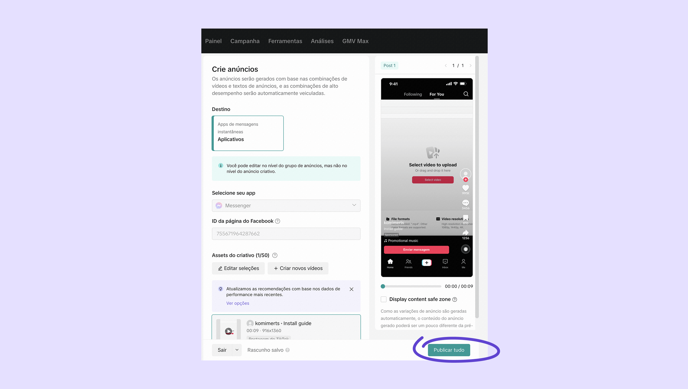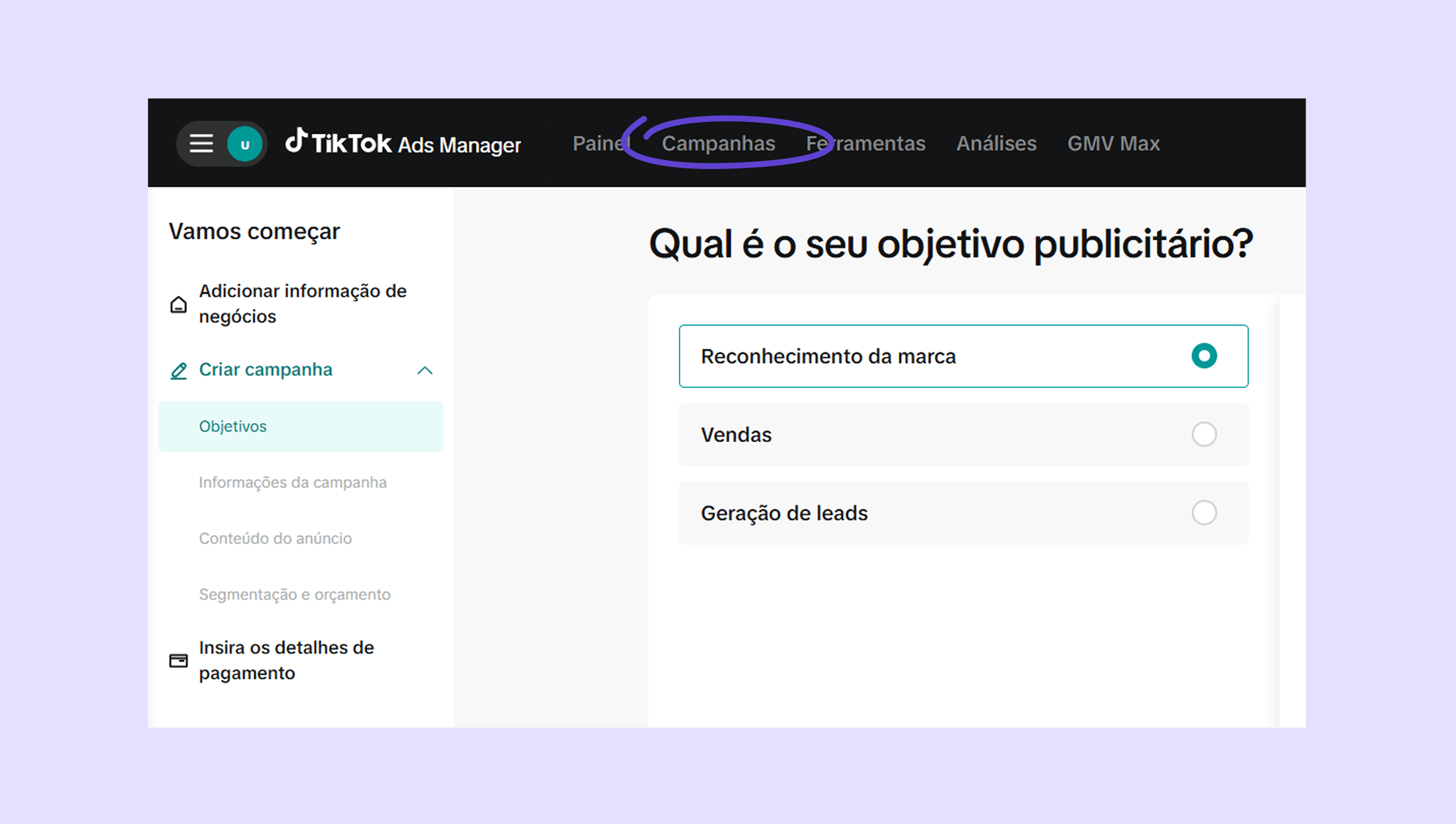 Feito isso, siga estas etapas para criar seu primeiro anúncio de mensagens instantâneas no TikTok: