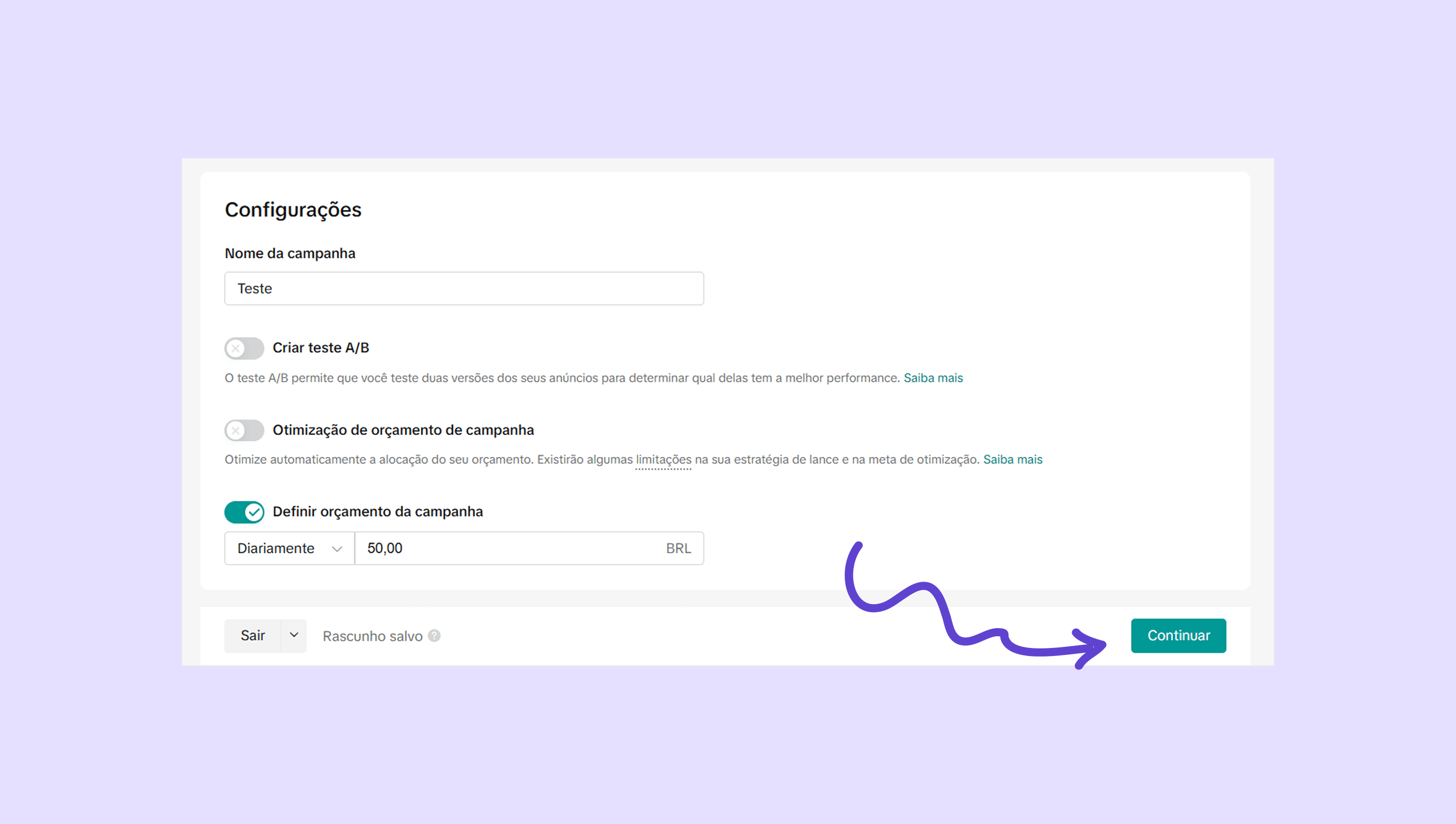 Role para baixo, dê um nome à sua campanha e (se estiver usando a Campanha Manual) defina seu orçamento. Clique em Continuar.