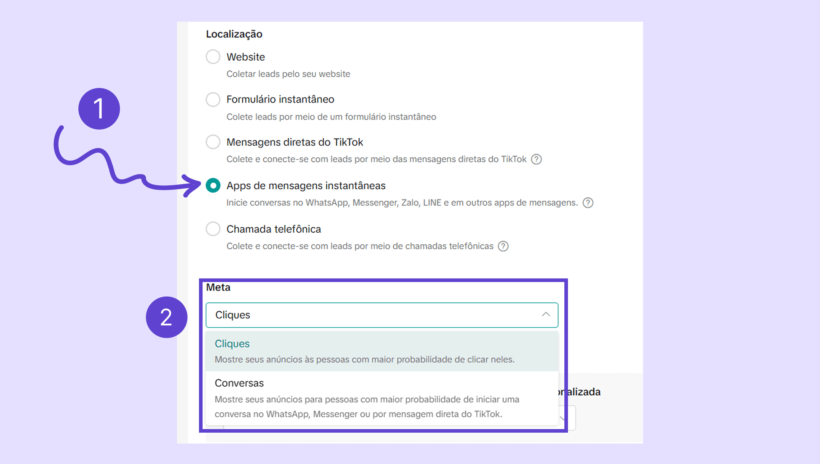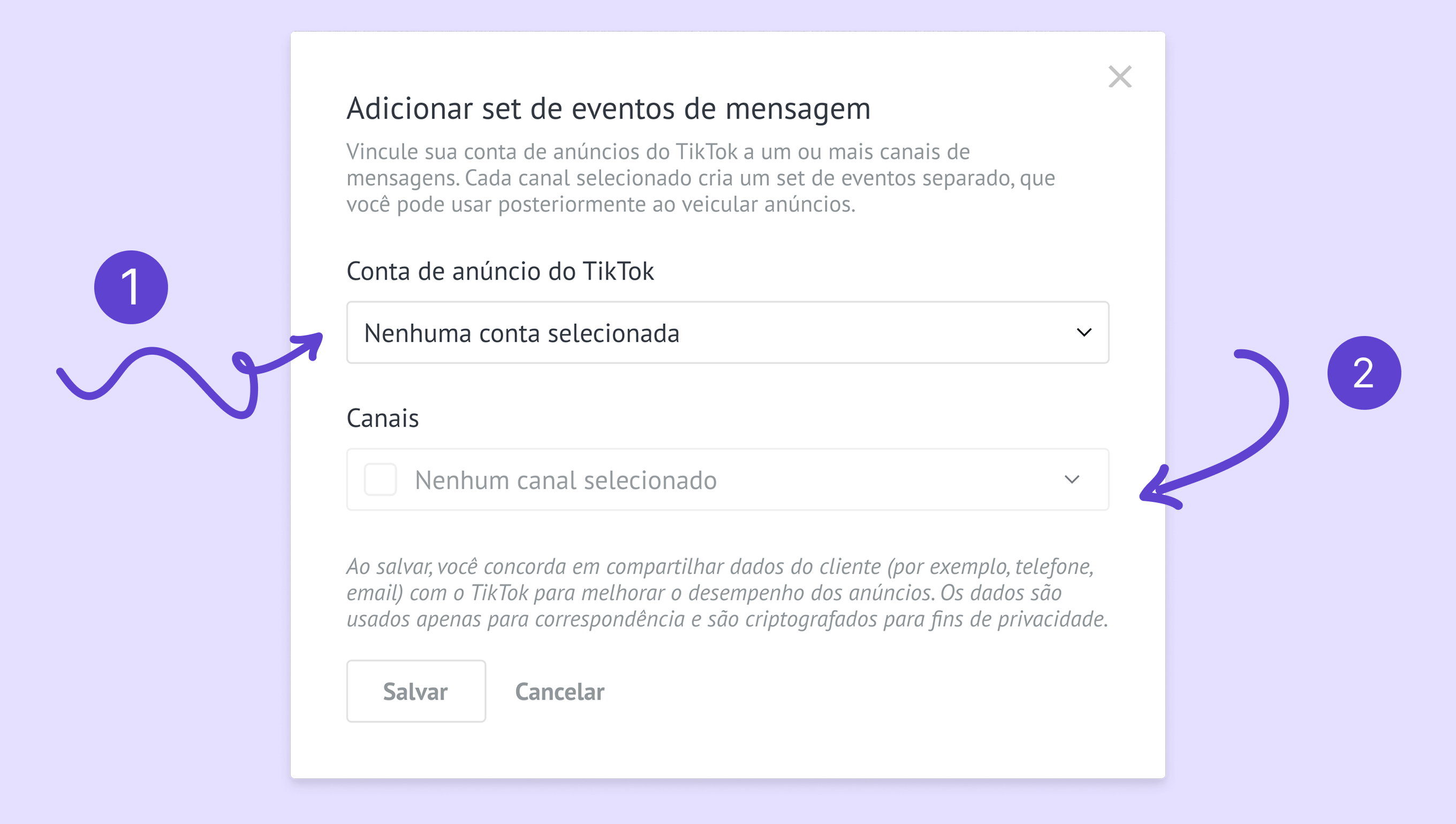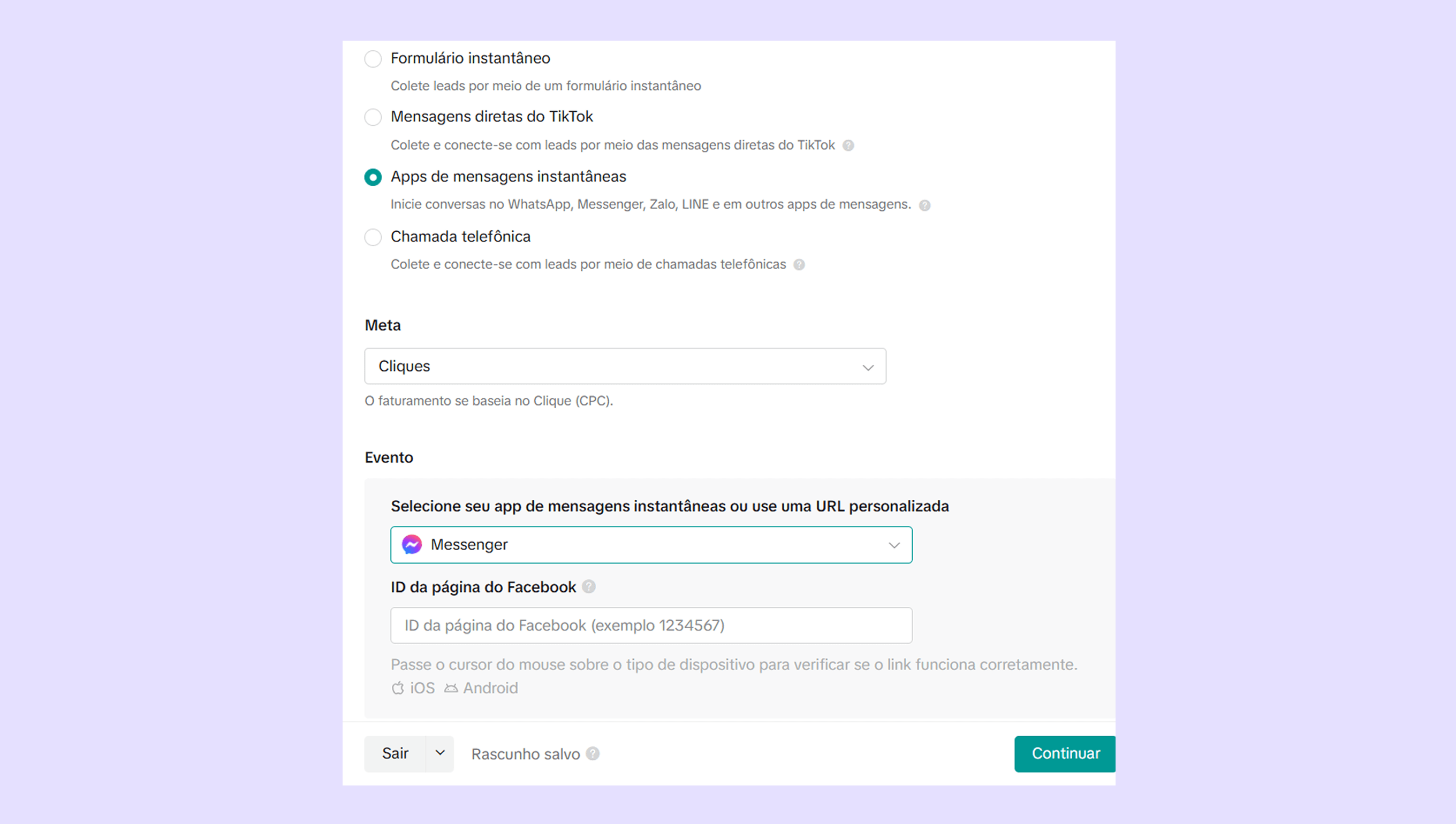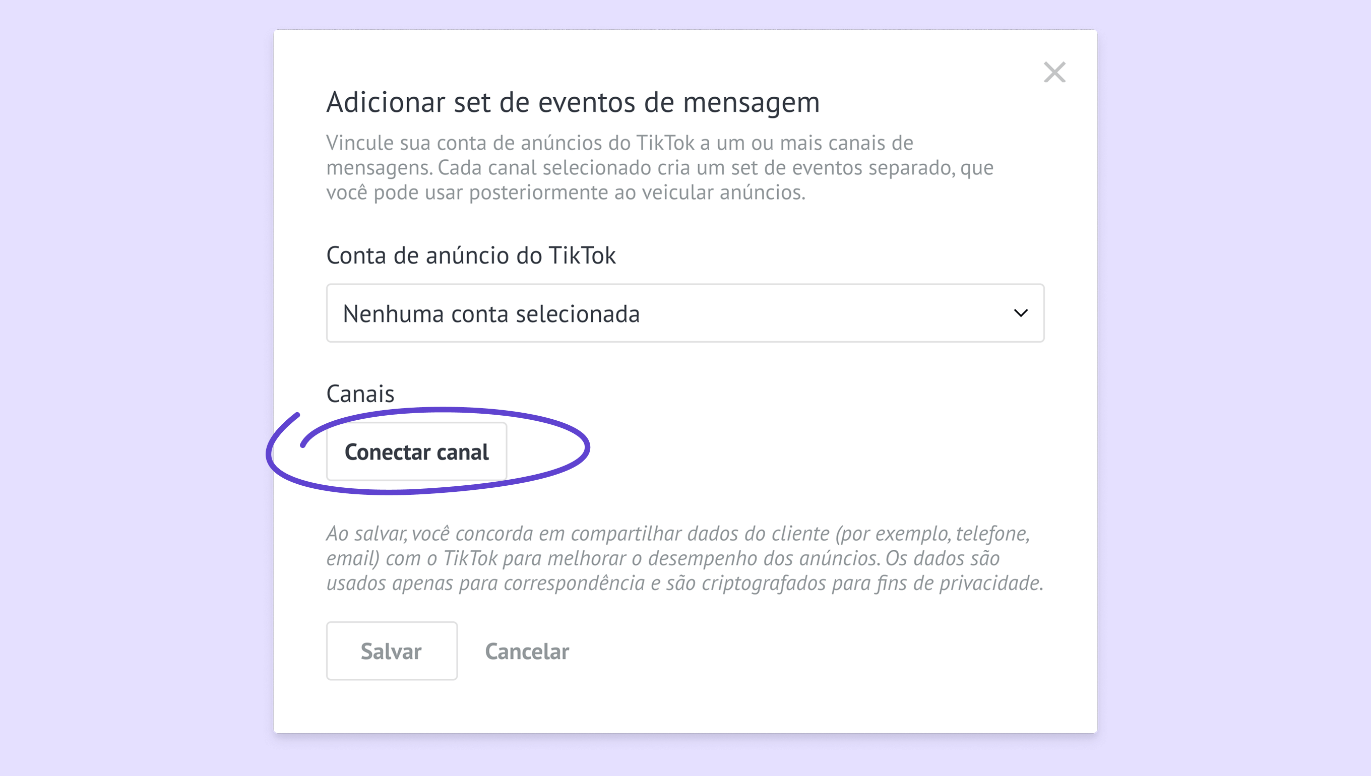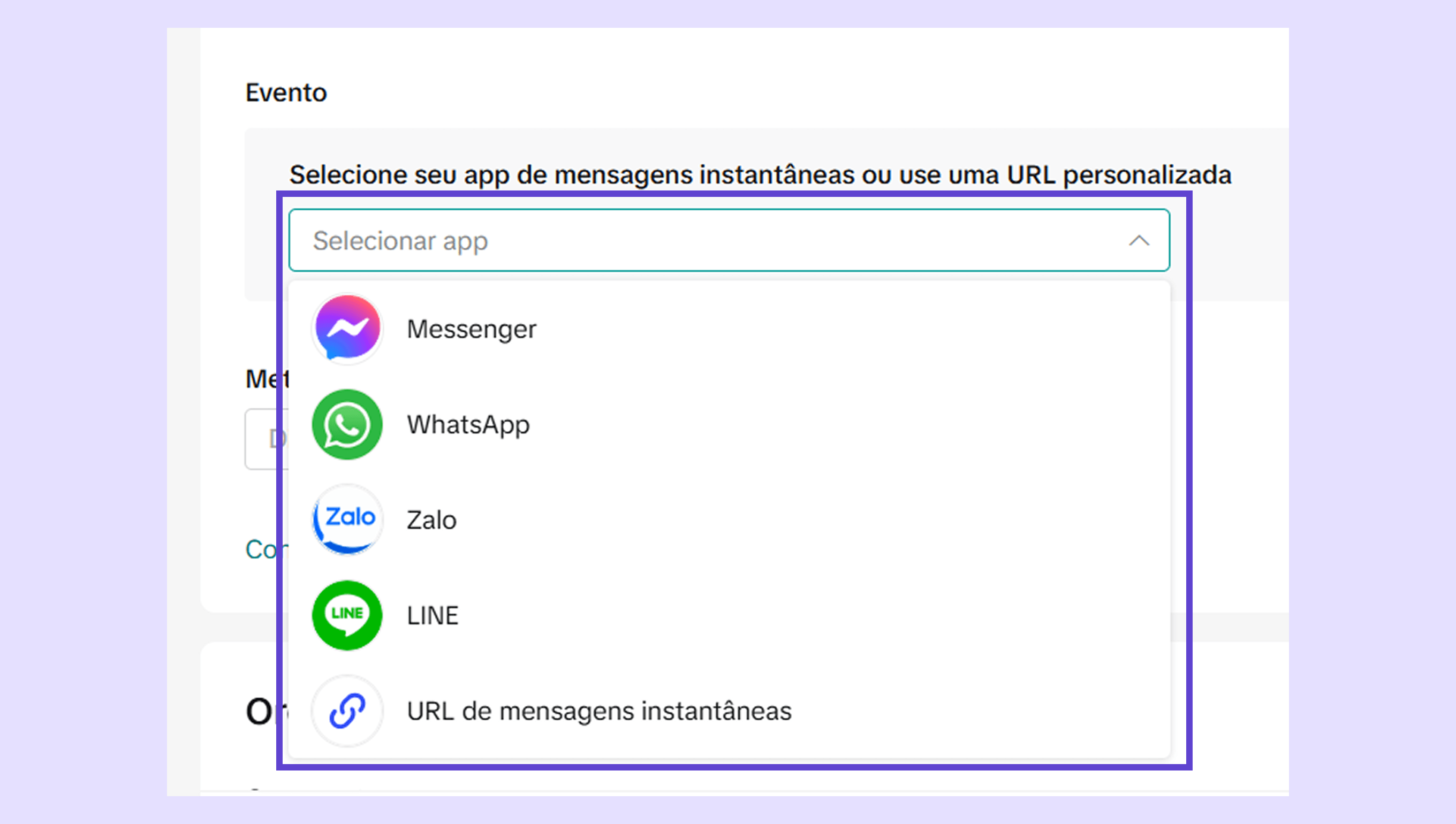 Um conjunto de eventos vincula sua conta do TikTok Ads a um canal de mensagens específico (como WhatsApp, Facebook Messenger ou TikTok). Ele define para onde os leads são enviados após clicarem no seu anúncio e ajuda o TikTok a rastrear ações importantes — como iniciar uma conversa, fazer um pedido ou concluir um pagamento — para melhorar a segmentação e o desempenho do anúncio.