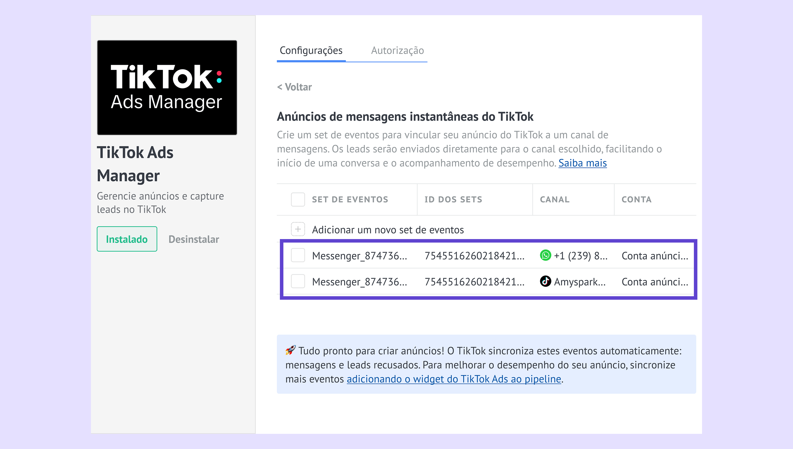 Observação: se suas mensagens não estiverem sincronizando, tente reautorizar sua integração com o TikTok Ads Manager.