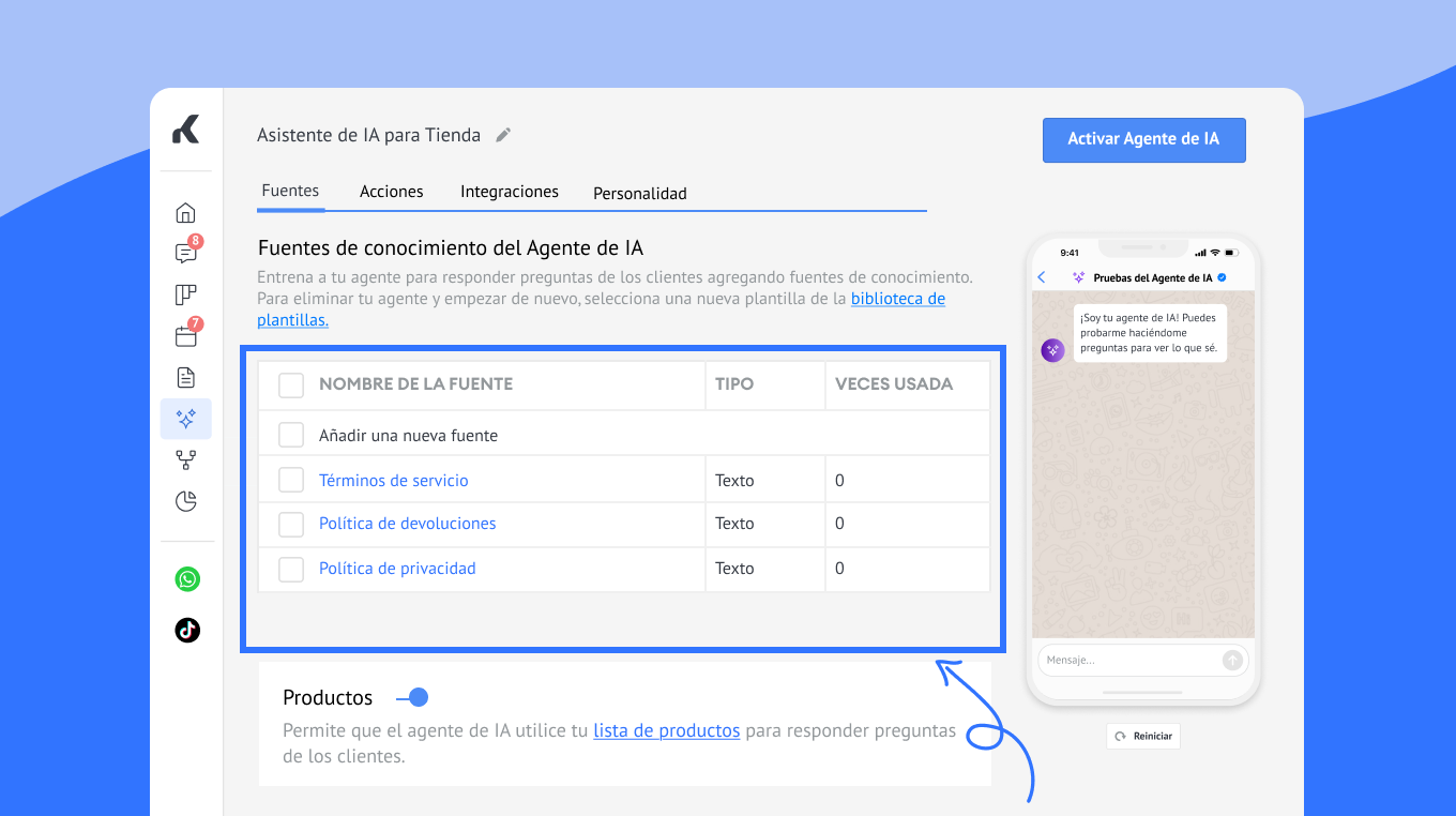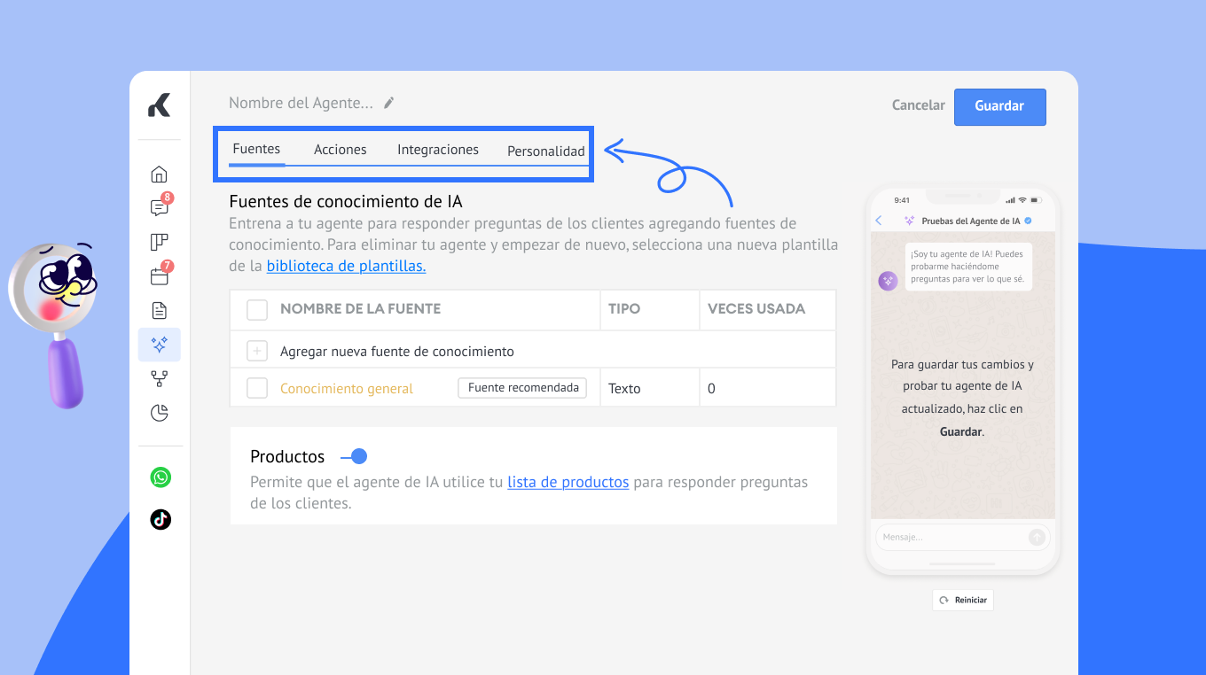 Configura cada uno de los 4 bloques fundamentales del agente de IA: Fuentes, Acciones, Personalidad e Integraciones.