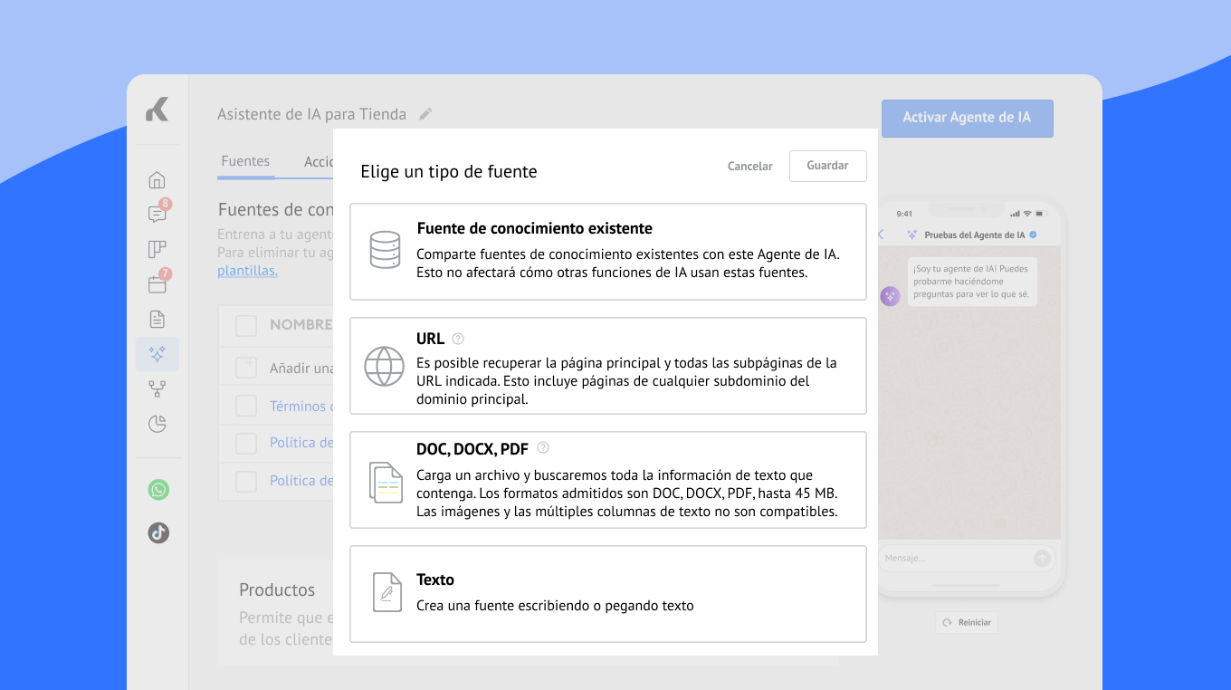 Carga tus fuentes de conocimiento en el generador de agentes de IA.