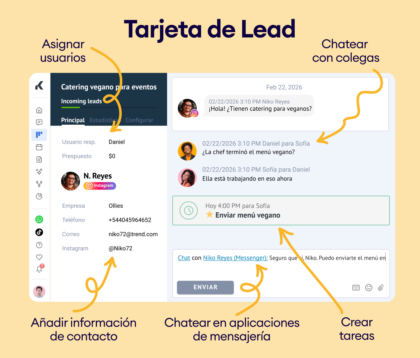 Puedes añadir notas, marcar detalles clave y asignar tareas a compañeros sin cerrar la Tarjeta de Lead. Ideal para unificar las comunicaciones y compartir en Direct Instagram cualquier mensaje desde una única plataforma.
