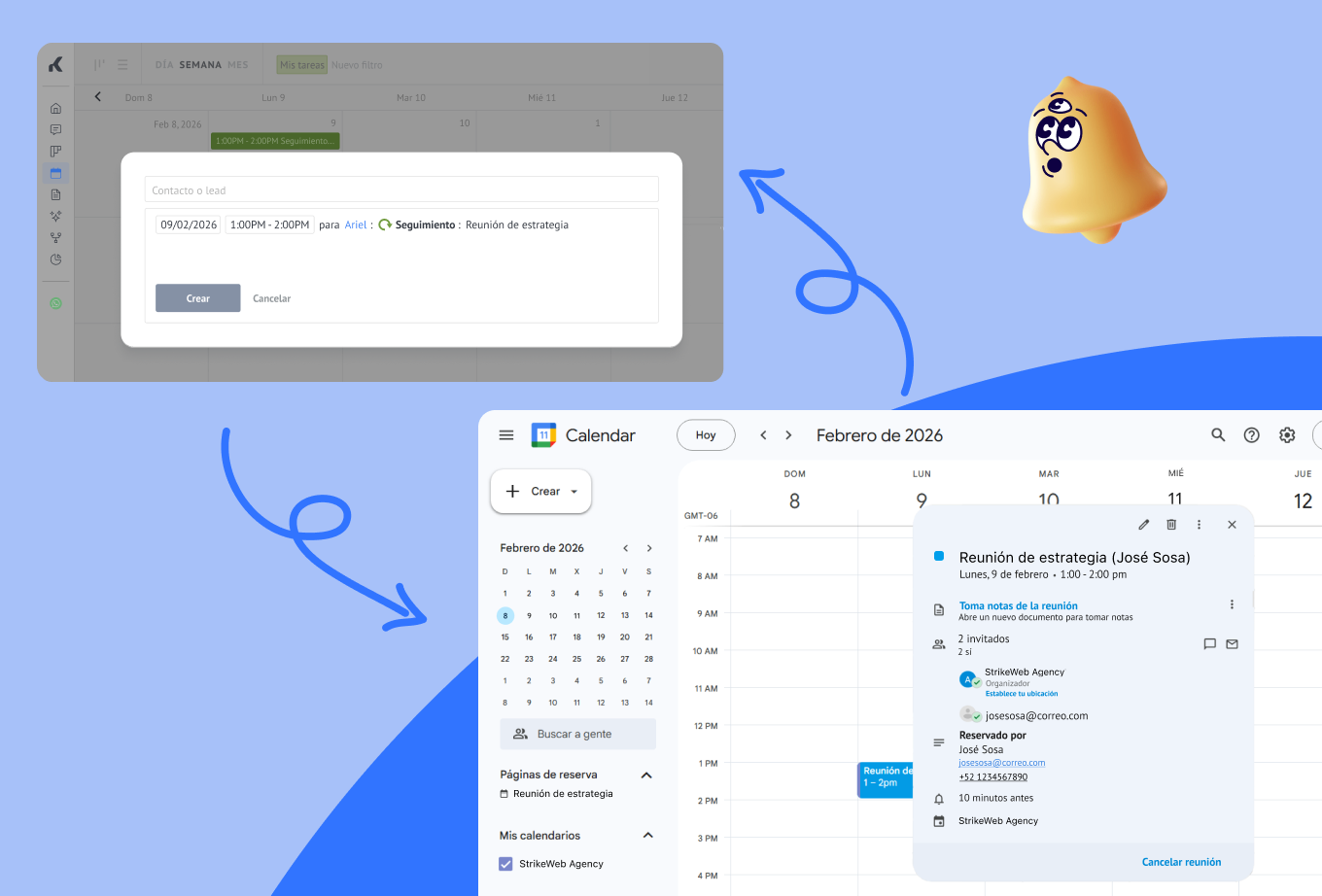 Gracias a la sincronización en tiempo real, puedes reprogramar reuniones desde la app de Google Calendar en tu teléfono y ver los cambios reflejados inmediatamente en tu CRM, con recordatorios automáticos de seguimiento.