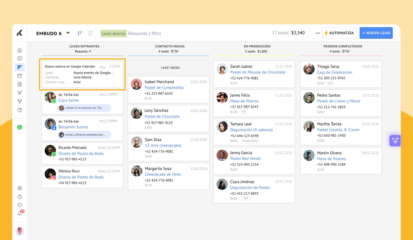 Cada vez que un cliente reserva un horario, Kommo crea automáticamente un nuevo lead en tu embudo bajo “Leads entrantes”.