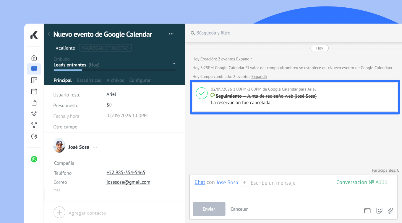 Si un cliente cancela su cita en Google Calendar, Kommo actualiza automáticamente la tarjeta de lead con una nota para que nunca pierdas información importante.
