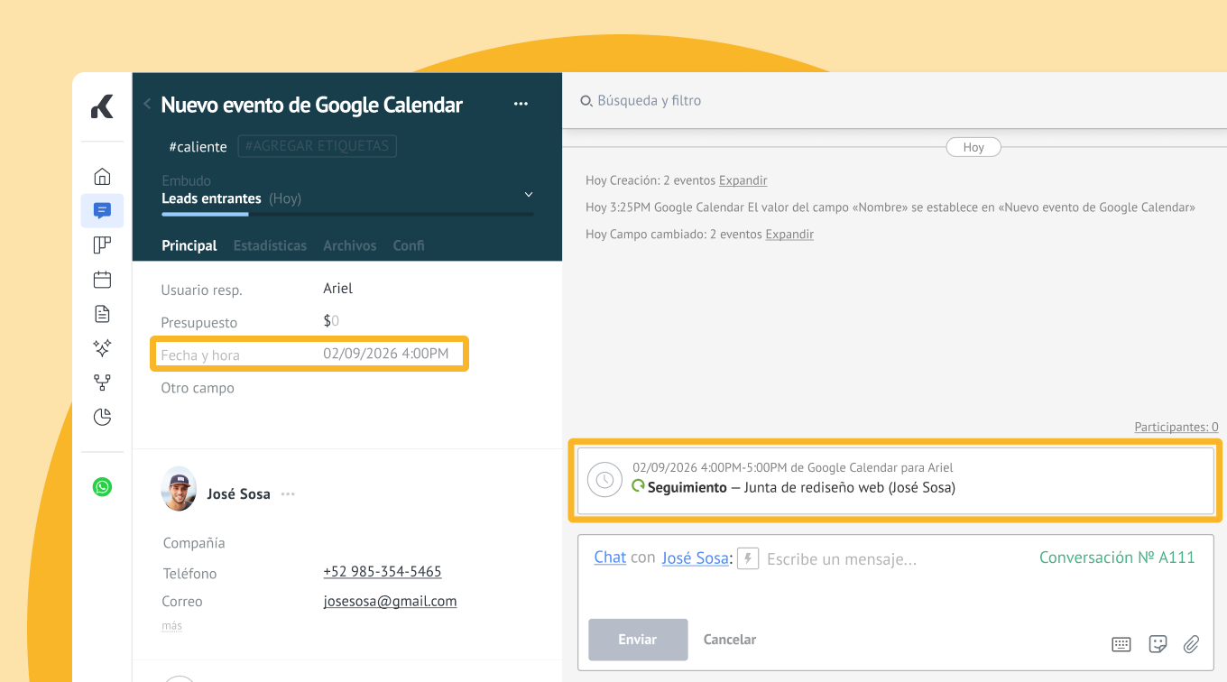 Esta integración elimina la necesidad de registrar reuniones dos veces o de cambiar entre aplicaciones. Cada vez que creas, editas o mueves un evento, los cambios se actualizan automáticamente en ambas plataformas y se reflejan en la tarjeta del lead dentro de Kommo, manteniendo tu agenda siempre organizada.