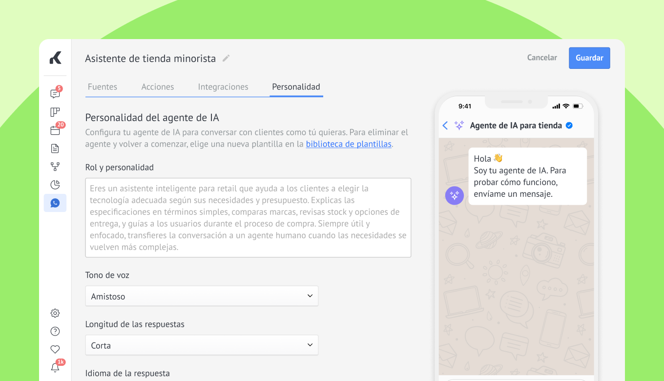 En la pestaña Personalidad, ajusta el tono, estilo y comportamiento del agente para que coincida con la voz de tu marca.
