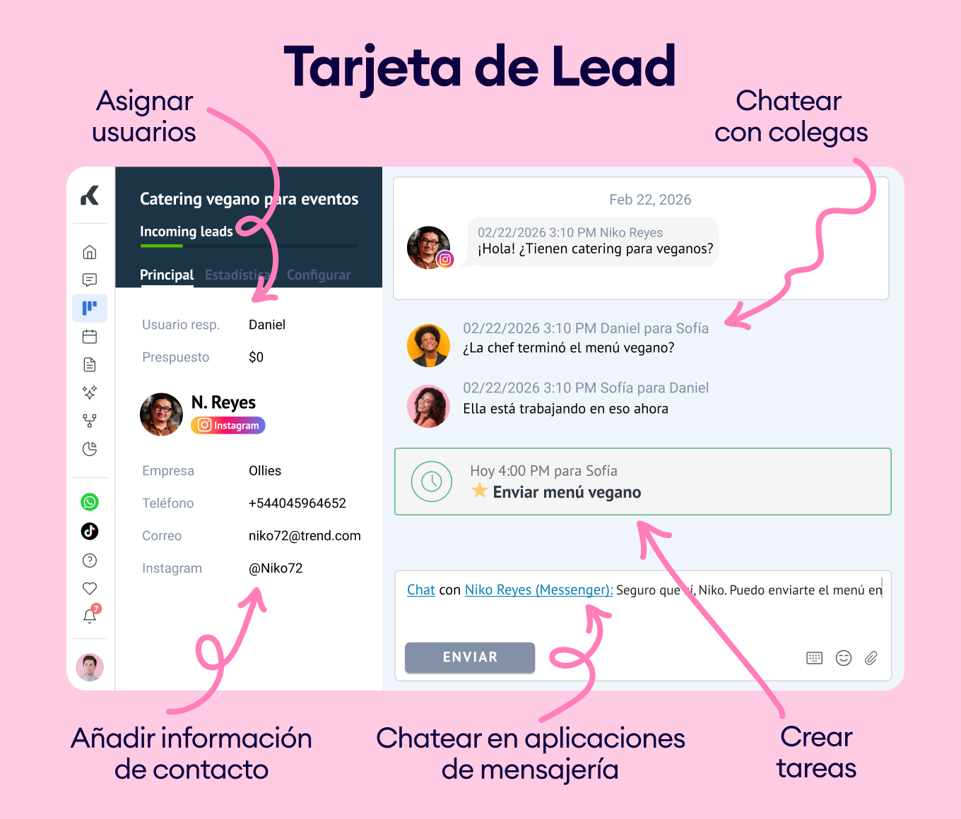 Puedes chatear con colegas, establecer tareas y crear recordatorios directamente dentro de la Tarjeta de lead de Kommo, agilizando tu flujo de trabajo y asegurándote de que todo y todos están atendidos. 😎