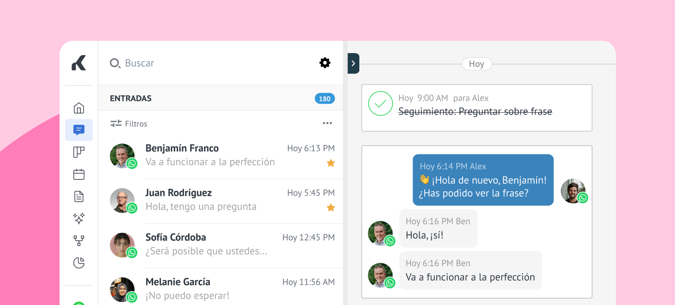 La integración de WhatsApp API en Kommo es una gran manera de llegar a los clientes utilizando sus canales de comunicación favoritos. 📣 Desde la primera interacción hasta la encuesta posterior a la compra, puedes chatear con tus clientes utilizando una plataforma equipada con herramientas que hacen que el proceso sea fluido para ti y tus clientes.