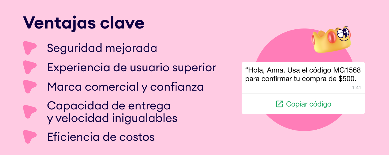 Experiencia de usuario superior: WhatsApp ofrece funciones avanzadas como la autenticación en un solo toque, la función autocompletar y la autenticación “zero-tap” . Con la función “zero-tap”, los usuarios de Android ni siquiera tienen que tocar un botón: la aplicación recibe el código de forma transparente y segura en segundo plano. Esto elimina la fricción del proceso de inicio de sesión o transacción y permite a los usuarios disfrutar de una verificación casi invisible.