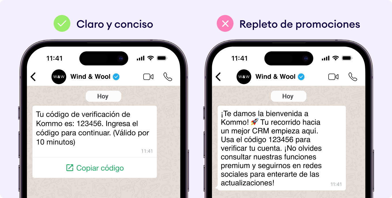 Usa un lenguaje directo: indica el propósito del mensaje de inmediato. Ejemplo: “Tu código de acceso de Kommo es 123456”. -