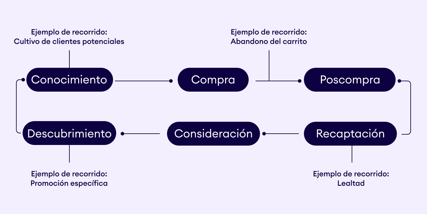 Debes entender el recorrido del cliente como un ciclo continuo, no como un camino lineal. Este modelo muestra etapas clave desde el Descubrimiento hasta la Postcompra y Reenganche, resaltando oportunidades para conectar con mensajes de marketing segmentados en cada paso.