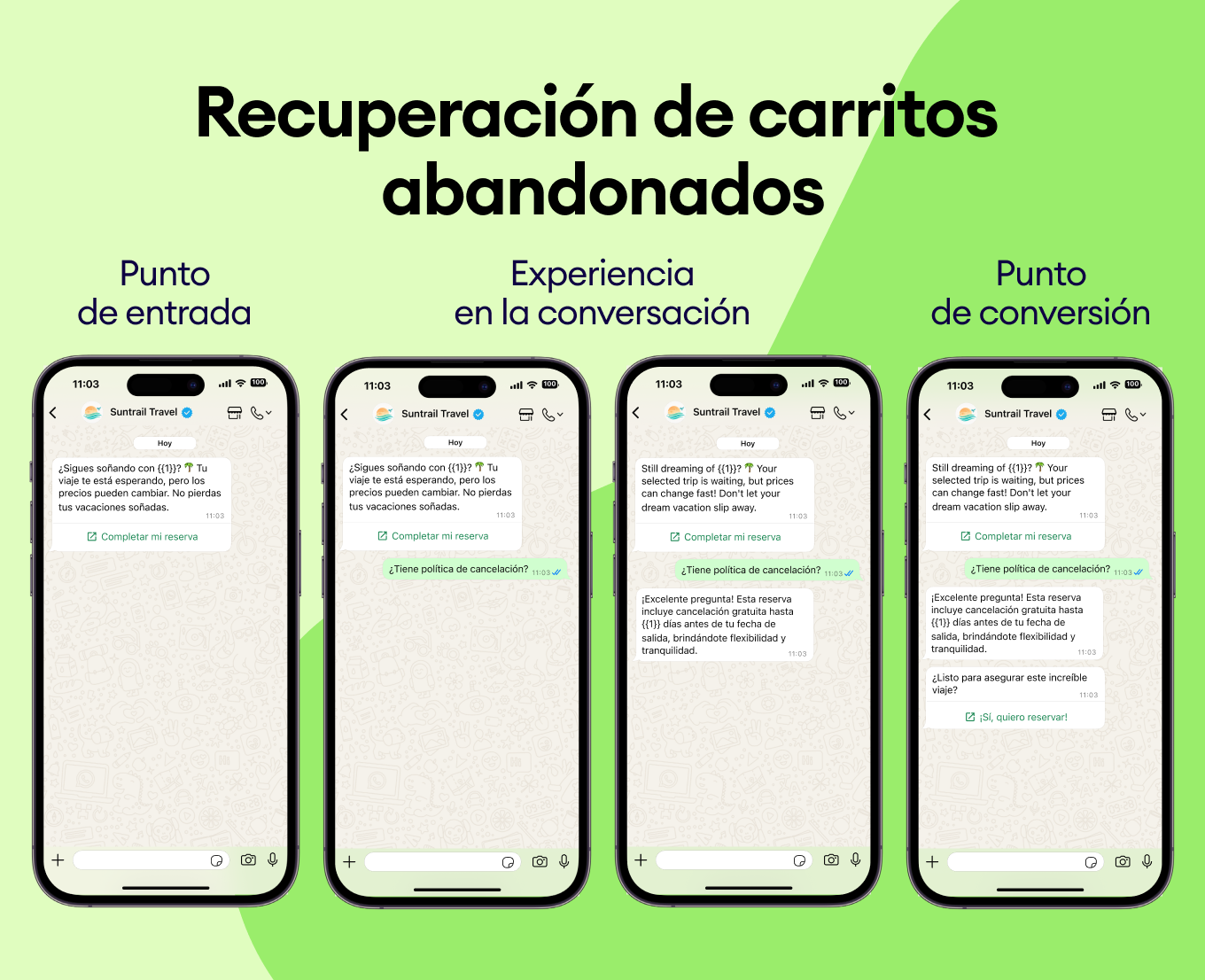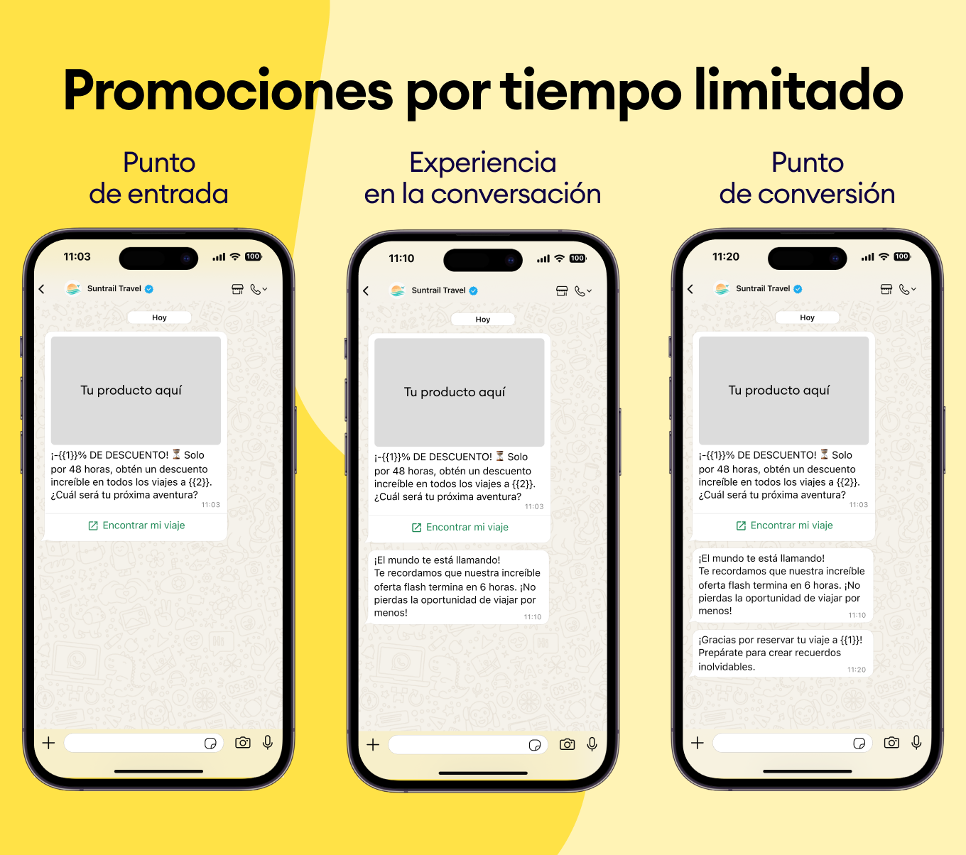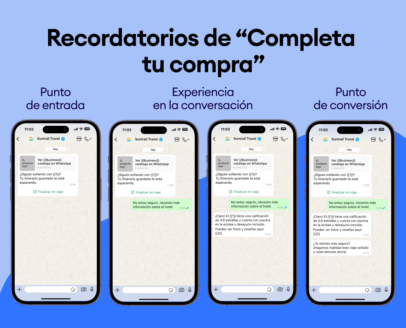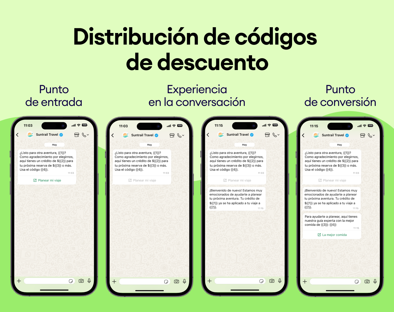 Usa el historial de compras de tus clientes para sugerirles nuevos destinos. Envía plantillas de WhatsApp como “¿Te encantó Bali? Te vas a obsesionar con Costa Rica” y asegúrate de que siempre elijan tu negocio.