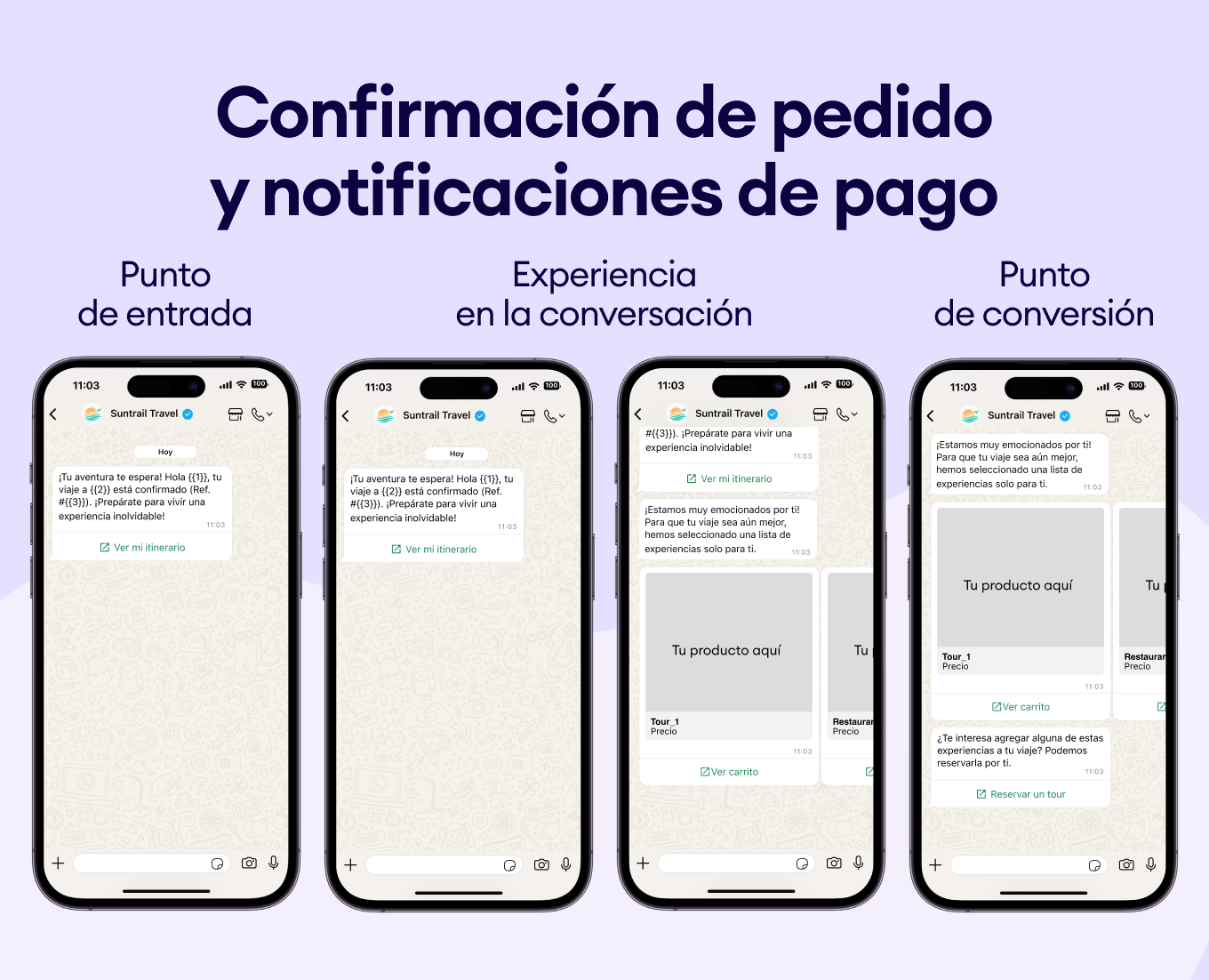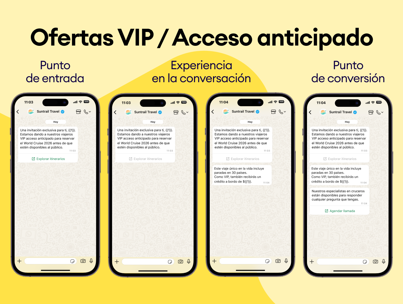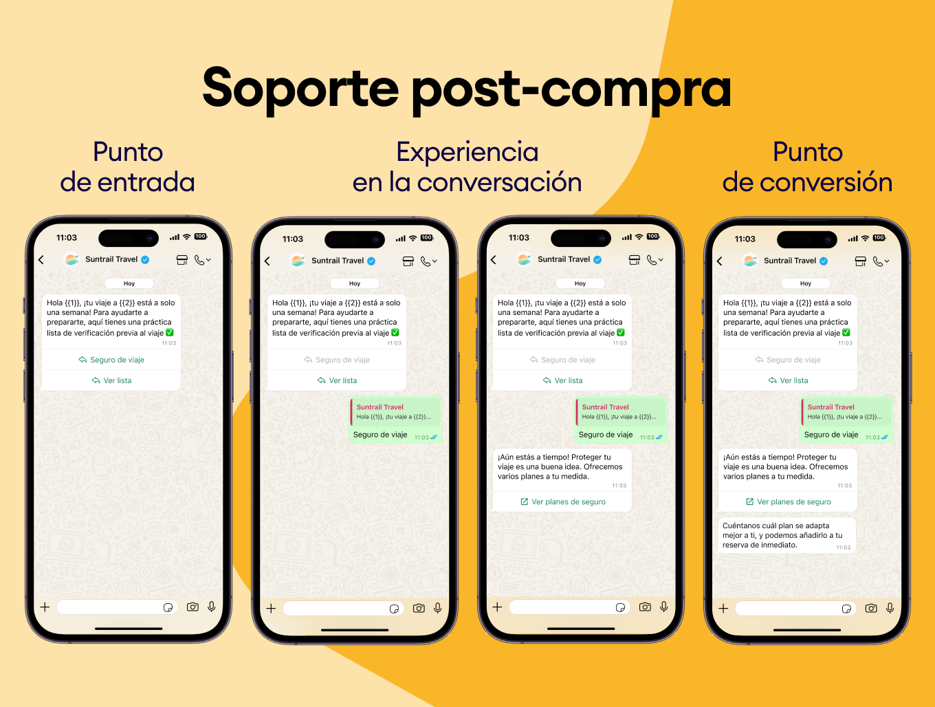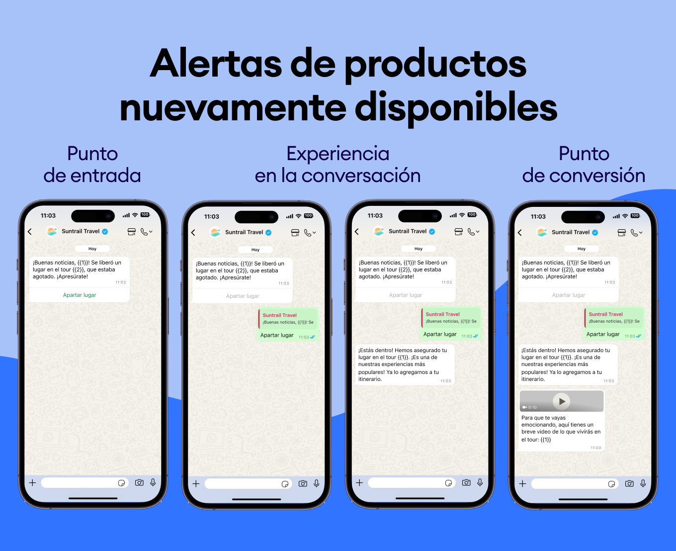 Usa el historial de compras de tus clientes para sugerirles nuevos destinos. Envía plantillas de WhatsApp como “¿Te encantó Bali? Te vas a obsesionar con Costa Rica” y asegúrate de que siempre elijan tu negocio.