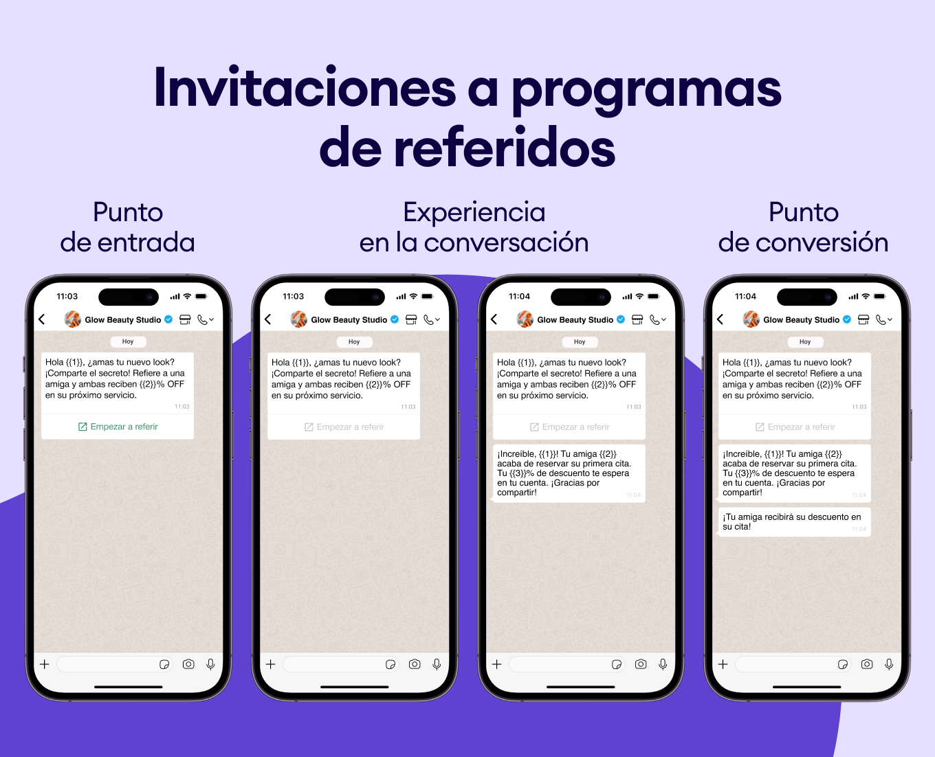 Motiva a tus clientes a compartir y ganar recompensas enviando invitaciones de referidos por WhatsApp para tu salón de belleza o servicios.